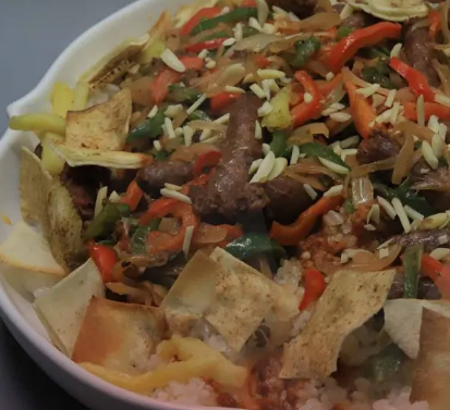 ثم يرص طبقات مع العيش الشامي و البطاطس و الأرز الأبيض و تقدم