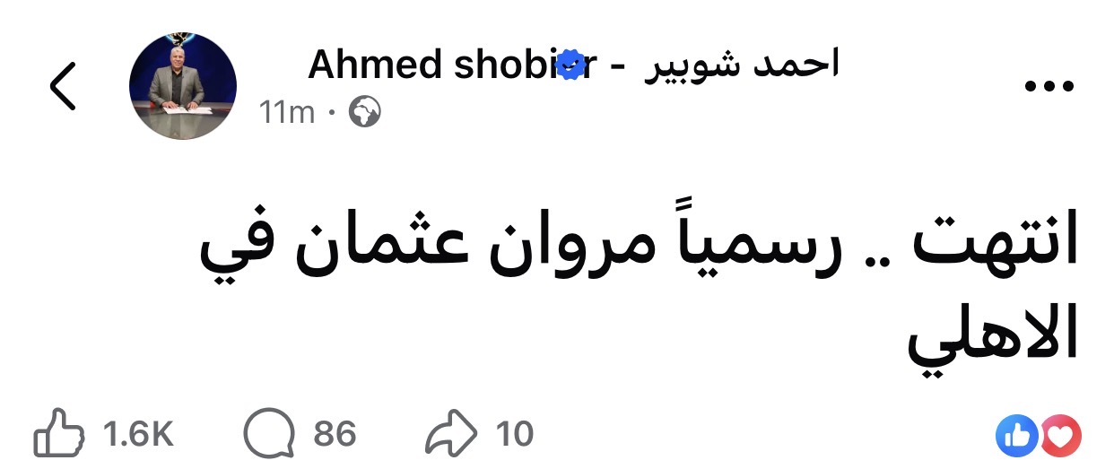 وكتب شوبير، عبر حسابه الشخصي بموقع فيسبوك: "انتهت .. رسمياً مروان عثمان في الاهلي".