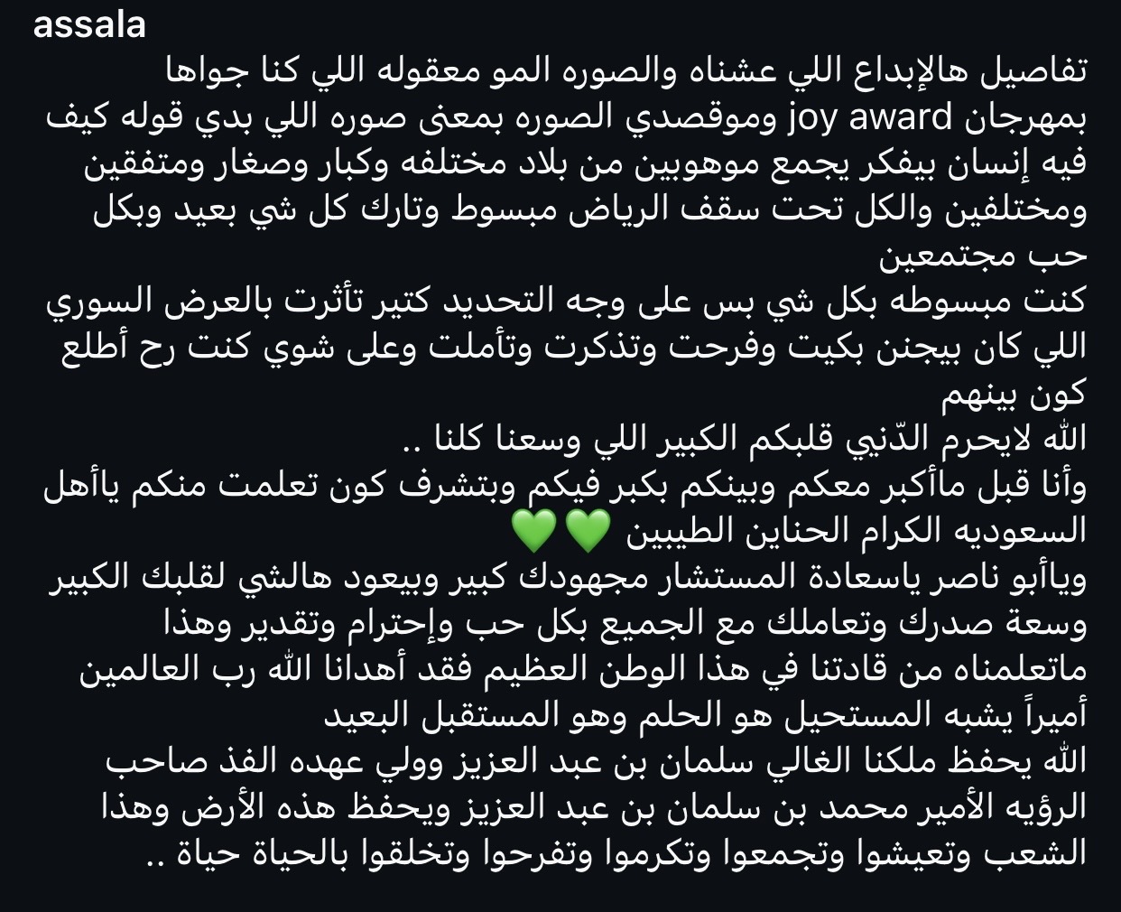 واختتمت أصالة تصريحها بالدعاء للملك سلمان بن عبد العزيز وولي عهده الأمير محمد بن سلمان، حفظهما الله، معربةً عن أمنياتها بمزيد من التقدير والاحتفال بالمواهب، وخلق لحظات مميزة في حياة الناس.