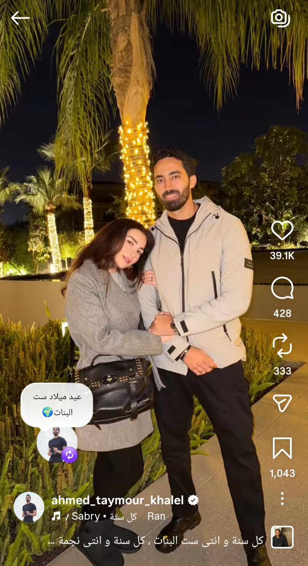 وكتب أحمد تيمور: "كل سنة وأنتِ ست البنات، كل سنة وأنتِ نجمة النجوم، كل سنة وأنتِ حبيبتي ومراتي وبنتي. كل سنة وأنتِ أغلى مخلوق على قلبي، كل سنة وأنتِ الحياة وما فيها، كل سنة وأنتِ ضحكتك بتحلي الدنيا كلها، وكل سنة وأنتِ جنبي، ناجحة ومحبوبة".