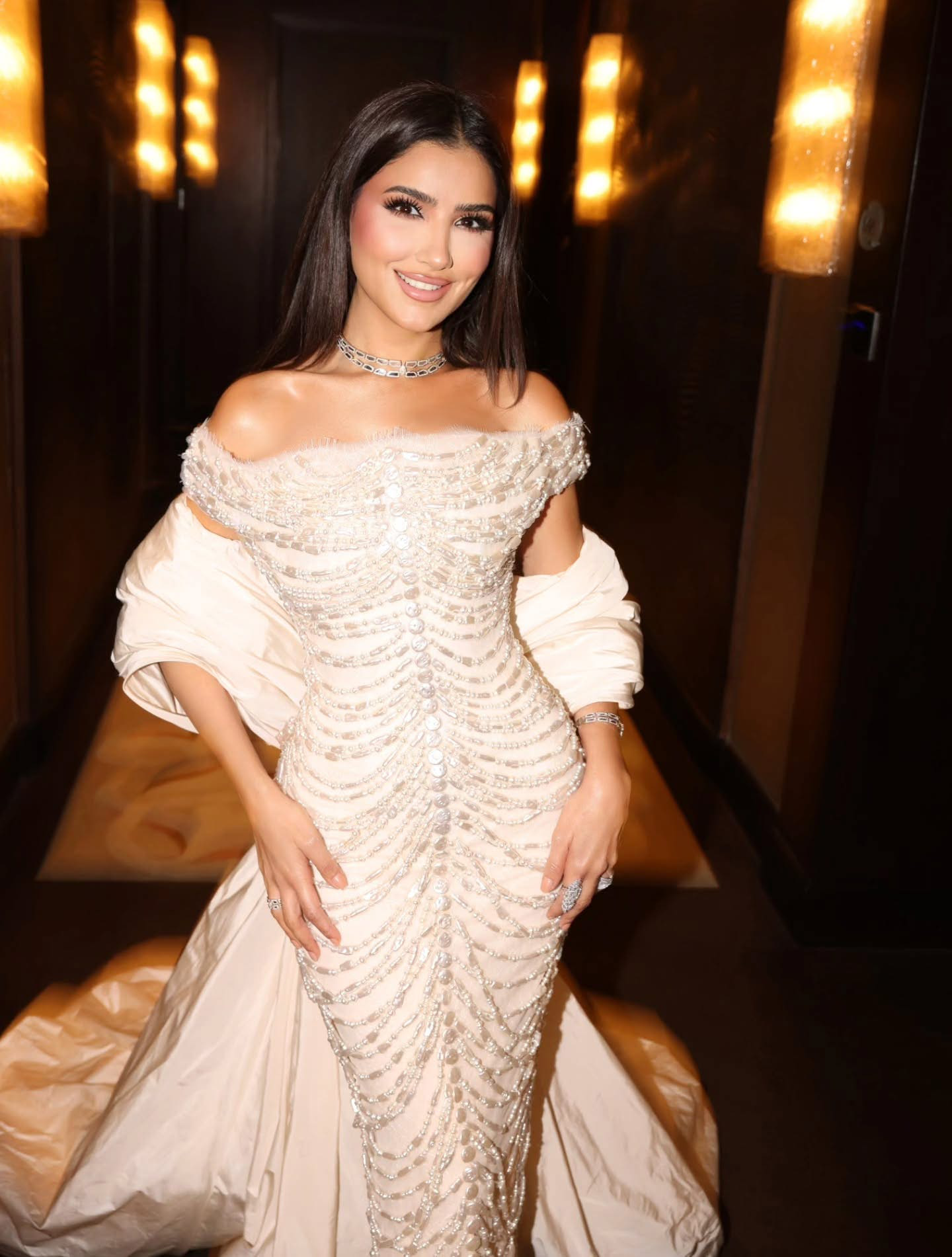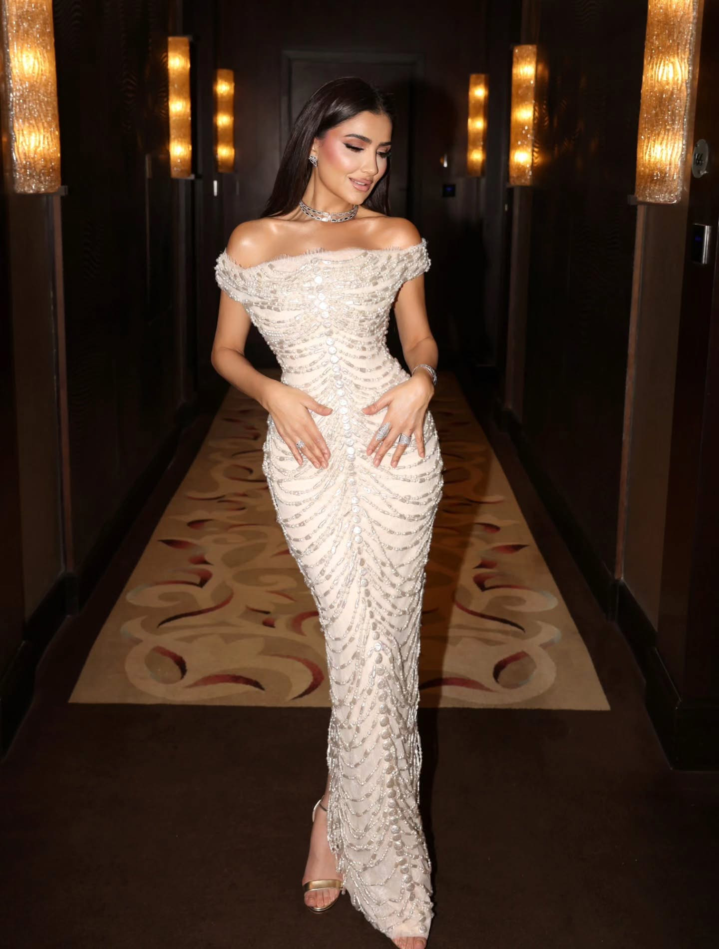 وظهرت مى بفستان من ابيضّ مطرز كشف عن خصرها المنحوت و قوامها الممشوق من تصميم سارة مراد.