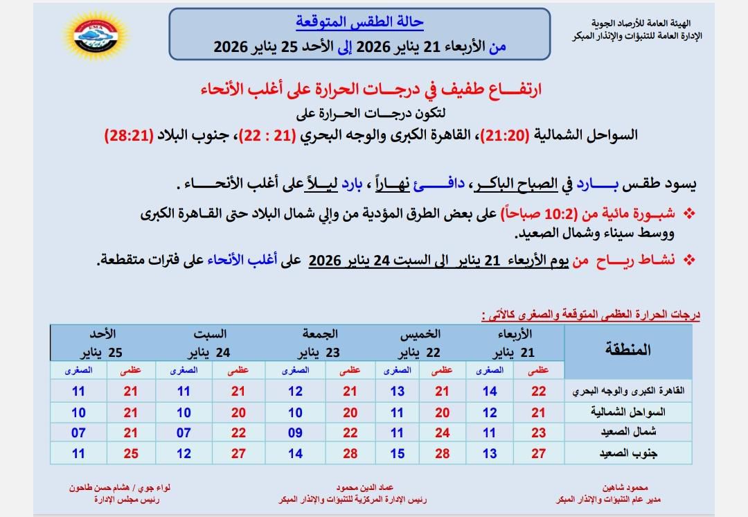 أوضحت هيئة الأرصاد الجوية، أن يكون الطقس بداية من الأربعاء المقبل بارد في الصباح الباكر، دافئ نهاراً، بارد ليلاً على أغلب الأنحاء، بالإضافة إلى شبورة مائية من 2 إلى 10 صباحاً على بعض الطرق المؤدية من وإلى شمال البلاد حتى القاهرة الكبرى ووسط سيناء وشمال الصعيد.