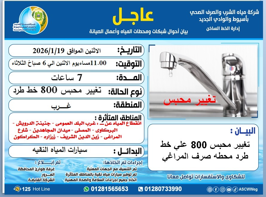 أعلنت شركة مياه الشرب والصرف الصحي بأسيوط والوادي الجديد عن انقطاع مؤقت للمياه لمدة 7 ساعات عن بعض مناطق حي غرب أسيوط، اعتبارًا من الساعة 11 مساء اليوم الاثنين وحتى الساعة 6 صباح غدا الثلاثاء ، وذلك نتيجة تنفيذ أعمال صيانة طارئة على أحد الخطوط الرئيسية.