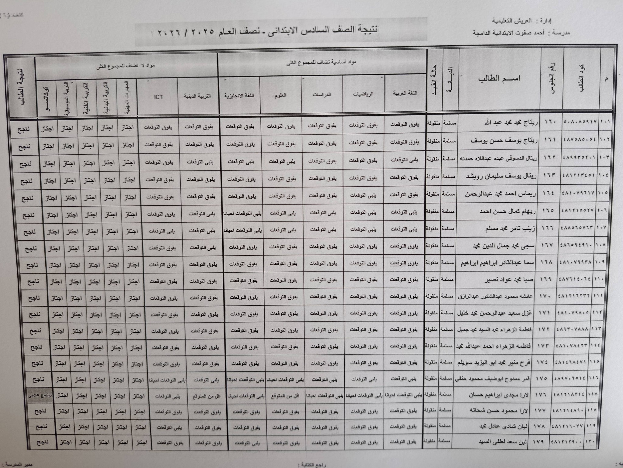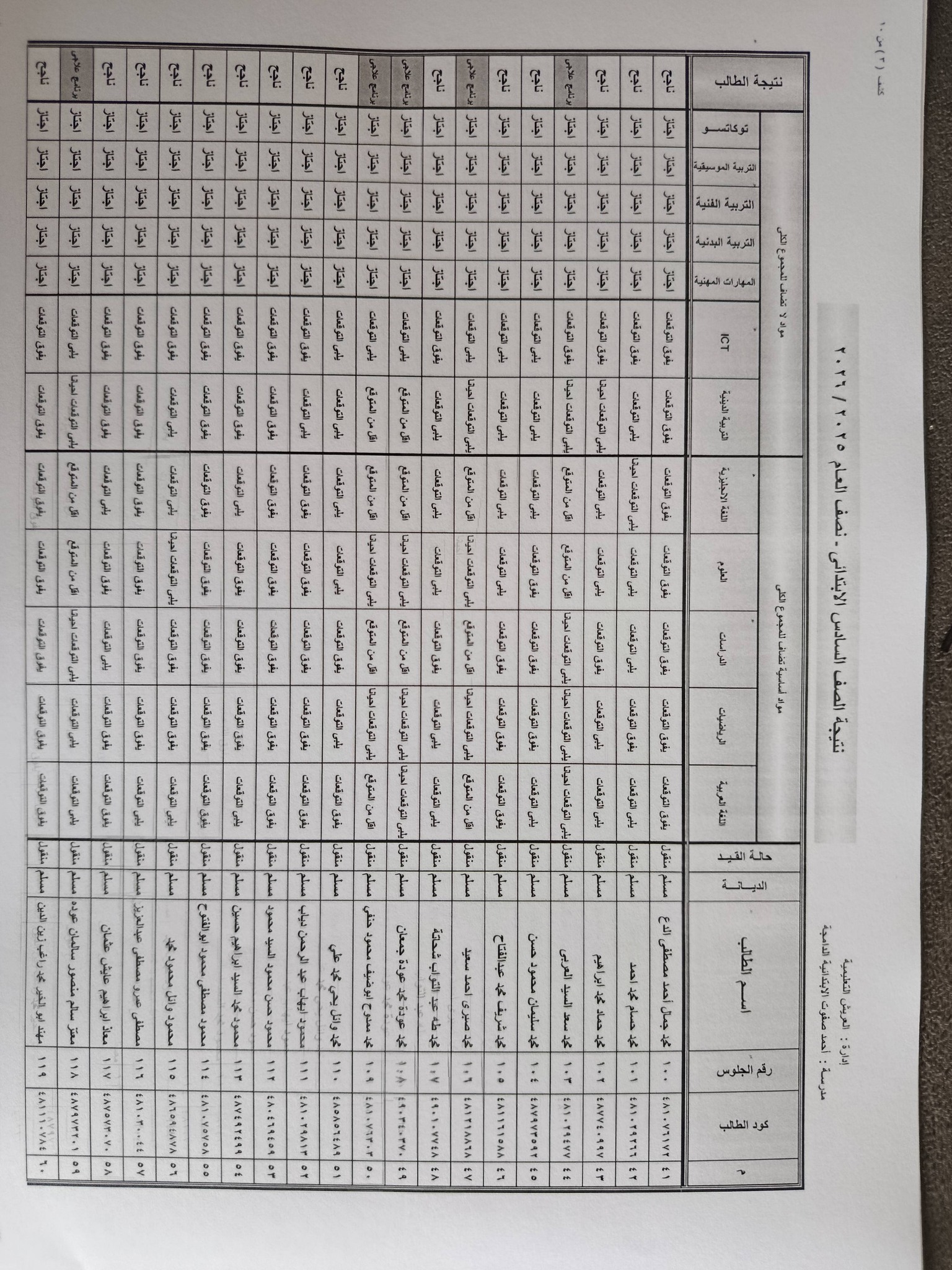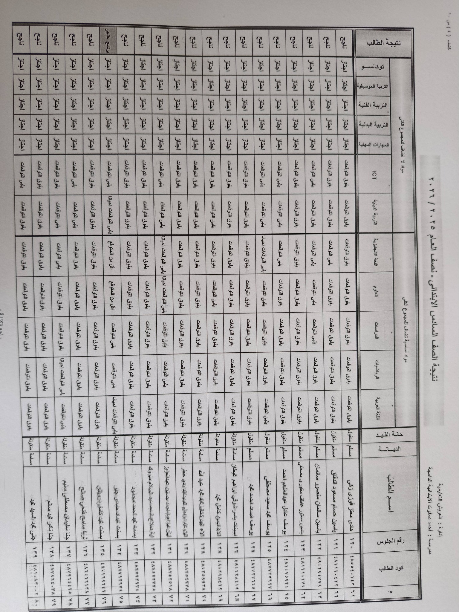 وتظهر في نتيجة الصف السادس الابتدائي برقم الجلوس والاسم 2026 درجات الطالب في :