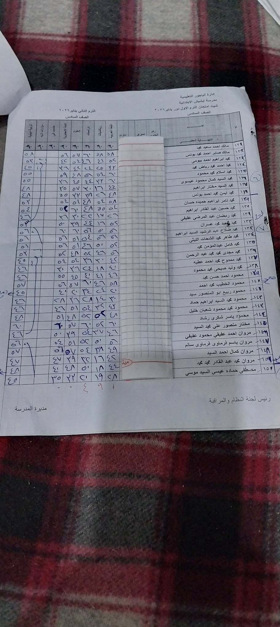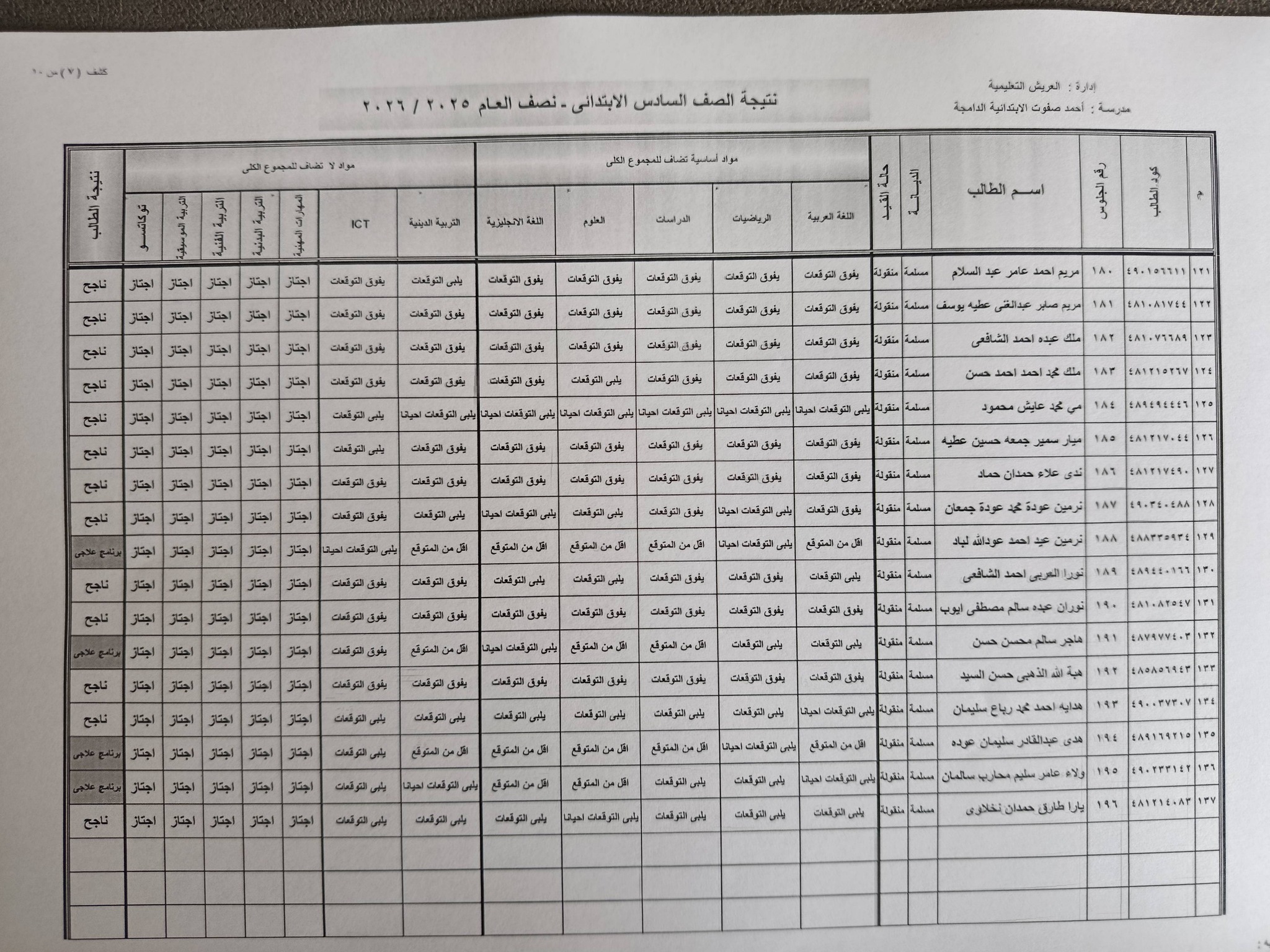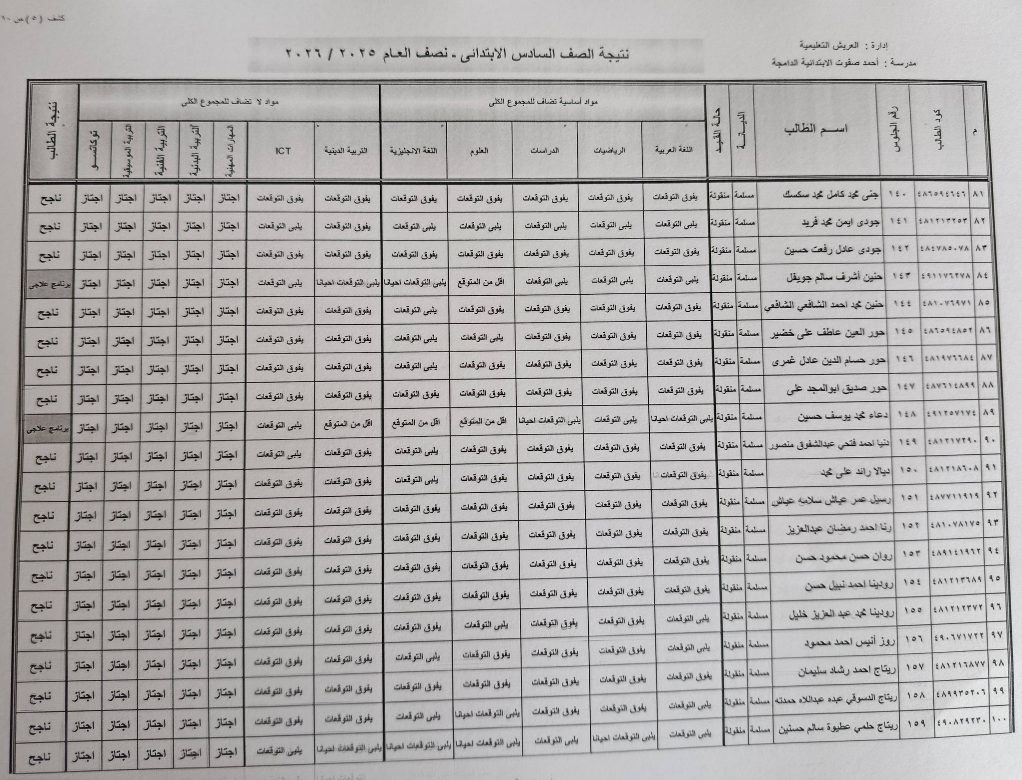 وتظهر في نتيجة الصف السادس الابتدائي برقم الجلوس والاسم 2026 درجات الطالب في :