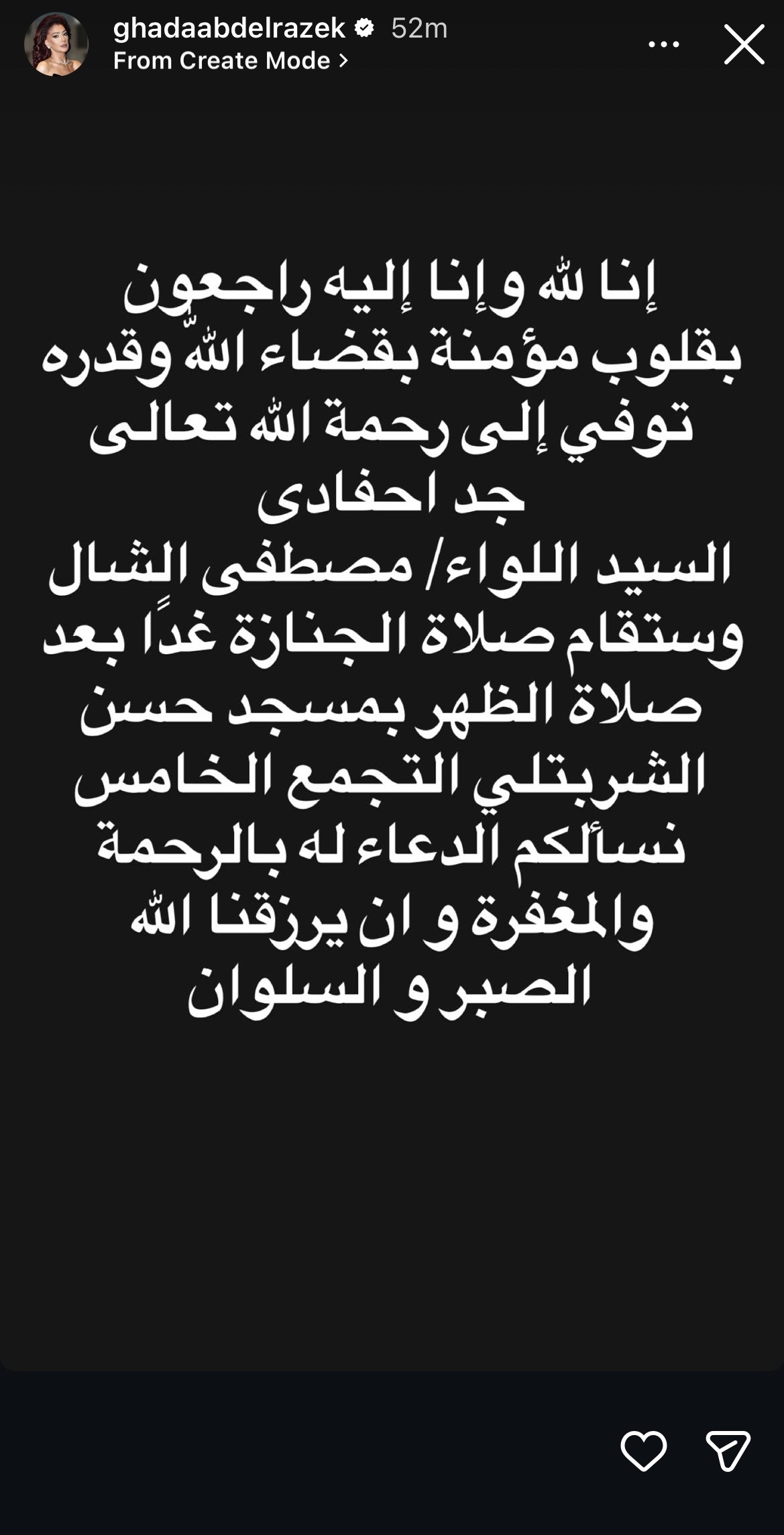 أعلنت الفنانة غادة عبد الرازق، وفاة جد أحفادها اللواء مصطفى الشال، ذلك عبر حسابها على انستجرام.
