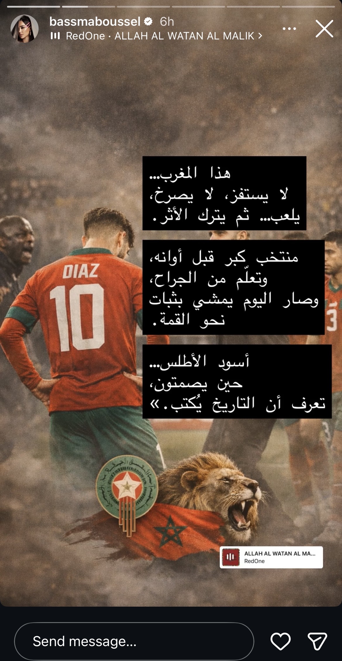 وكتبت بسمة بوسيل عبر خاصية الاستوري على انستجرام: "هذا المغرب لا يستفز، لا يصرخ، يلعب ثم يترك الأثر، منتخب كبر قبل أوانه، وتعلم من الجراح، وصار اليوم يمشي بثبات نحو القمة، أسود الأطلس حين يصمتون، تعرف أن التاريخ يكتب".