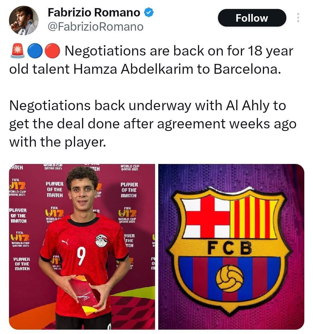 وبحسب الصحفي الموثوق فابريزيو رومانو، فإن المحادثات استؤنفت رسميًا مع النادي الأهلي، بعدما كان برشلونة قد توصل إلى اتفاق مبدئي مع اللاعب قبل أسابيع، على شروطه الشخصية.