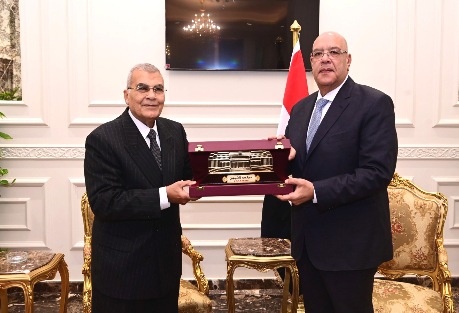 وفي ختام اللقاء، أهدى المستشار عصام فريد، رئيس مجلس الشيوخ، درع مجلس الشيوخ إلى المستشار هشام بدوي.