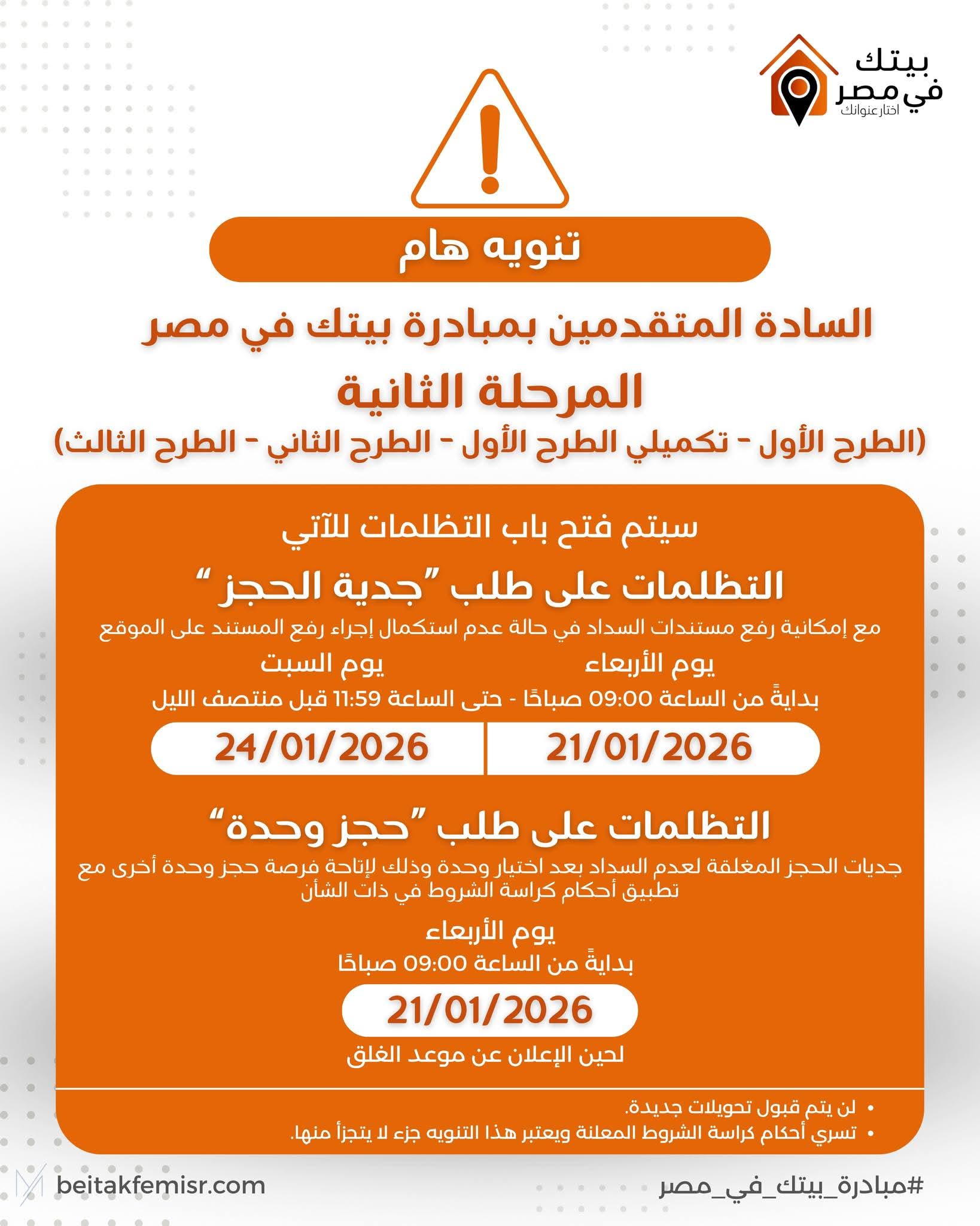 ودعت مبادرة «بيتك في مصر» جميع المتقدمين إلى الالتزام بالمواعيد المقررة.