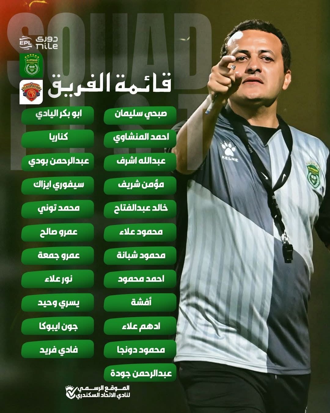 أعلن تامر مصطفى المدير الفني للفريق الأول لكرة القدم بنادي الاتحاد السكندري عن قائمة فريقه استعداداً لمواجهة سيراميكا كليوباترا في إطار مباريات الأسبوع الخامس عشر لمسابقة الدوري الممتاز موسم 2025– 2026
