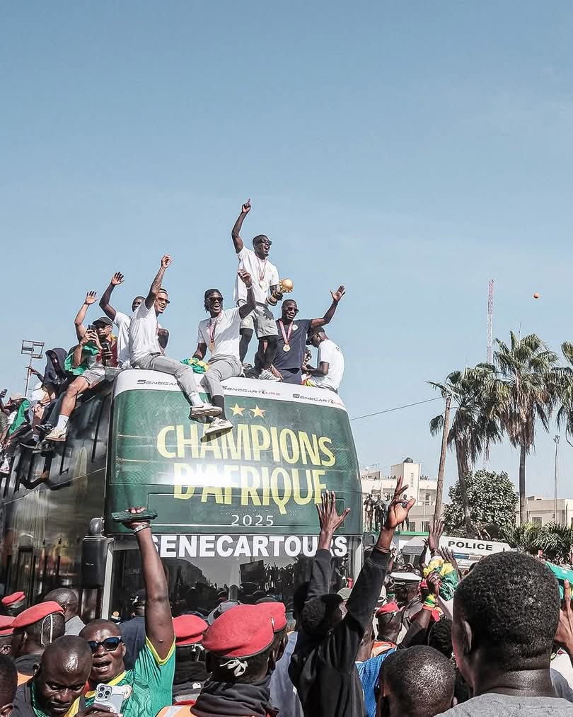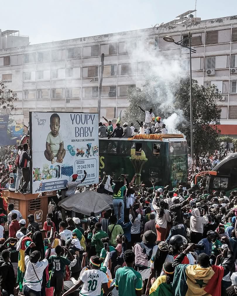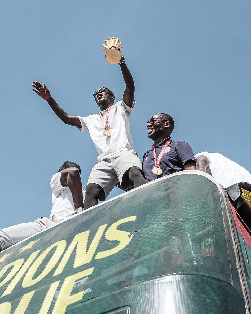 سار المنتخب السنغالي في شوارع دكار بحافلة مكشوفة تسير ببطء وسط أعداد كبيرة من الجماهير التي ارتدت قميص منتخب بلادها، واحتفلت بأبواق الفوفوزيلا وأبواق السيارات والهتافات.