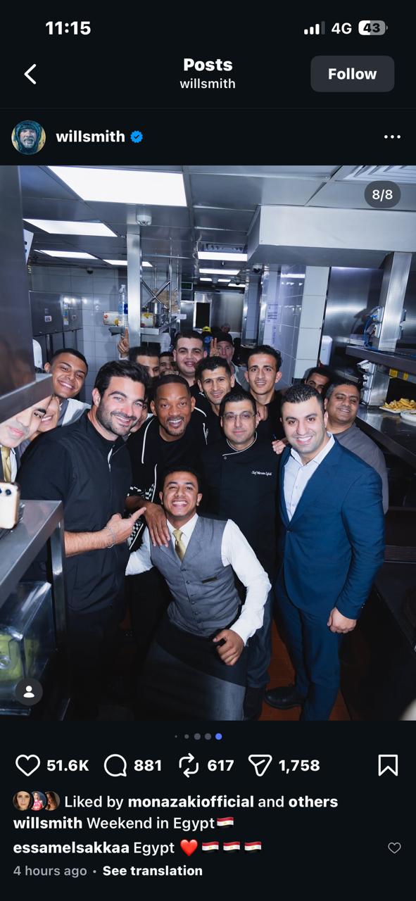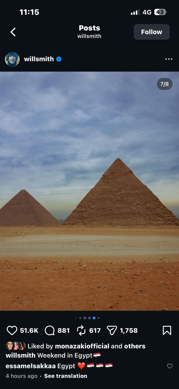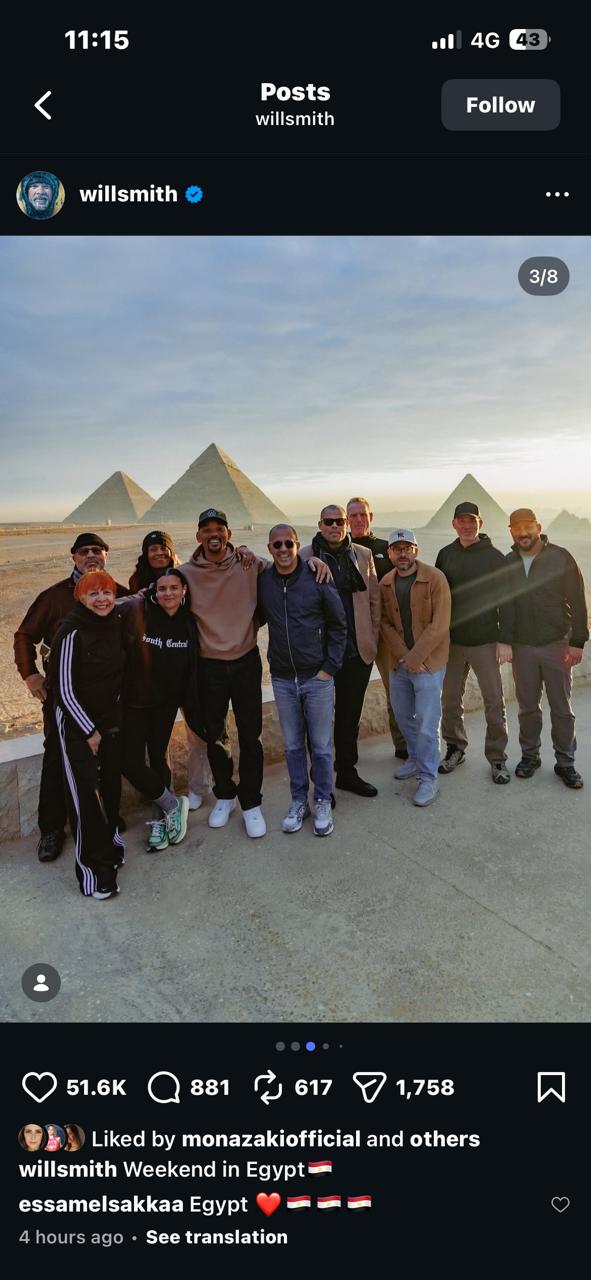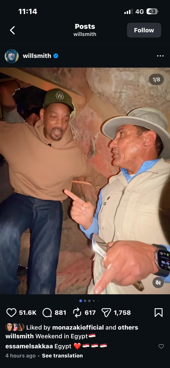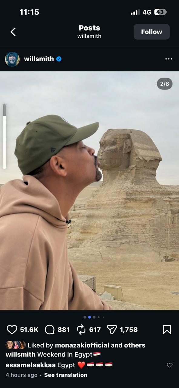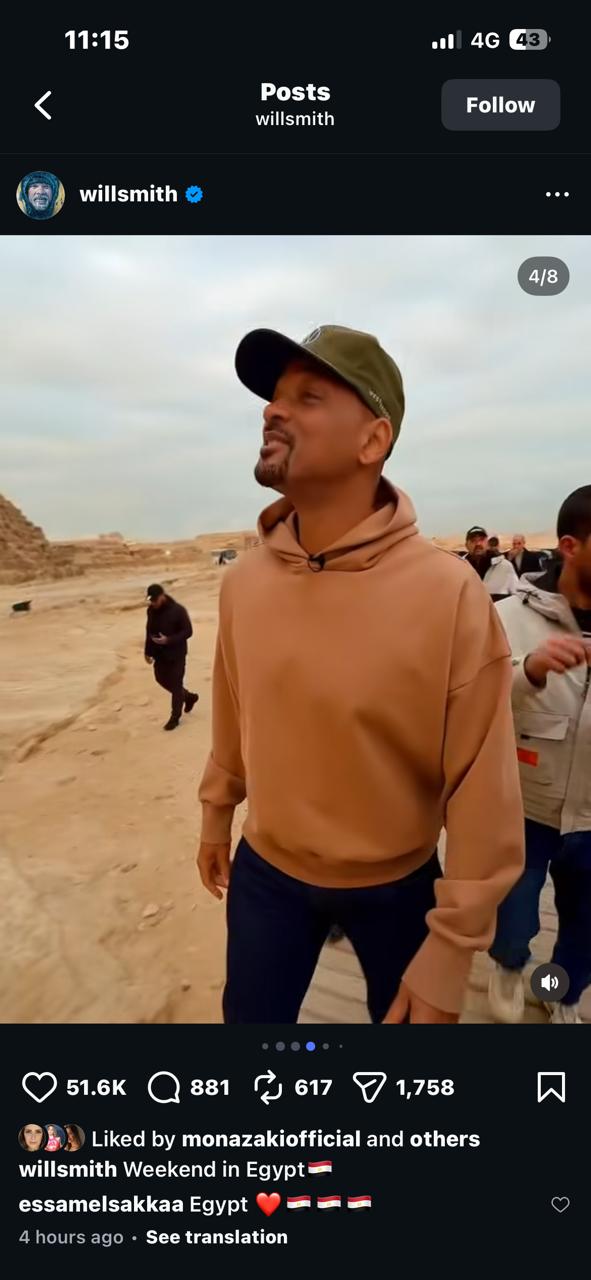 شارك النجم العالمي، ويل سميث المزيد من الصور ومقاطع الفيديوهات من زيارته الأخيرة لمصر،عبر صفحتة الرسمية على موقع التواصل الاجتماعي إنستجرام.