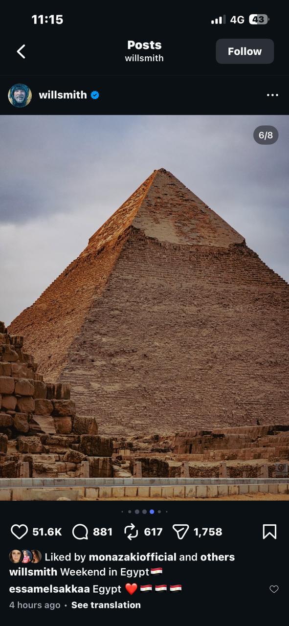 وفي وقت أخر كان قد شارك النجم العالمي ويل سميث متابعيه لحظات استثنائية من زيارته للهرم الأكبر بالجيزة، حيث نشر مقطع فيديو عبر حسابه الرسمي على موقع فيسبوك، اصطحبهم خلاله في جولة داخل أحد أعظم الشواهد على الحضارة الإنسانية. ووصف سميث التجربة بأنها مغامرة فريدة تشبه استكشاف عالم تاريخي مغلق منذ آلاف السنين.