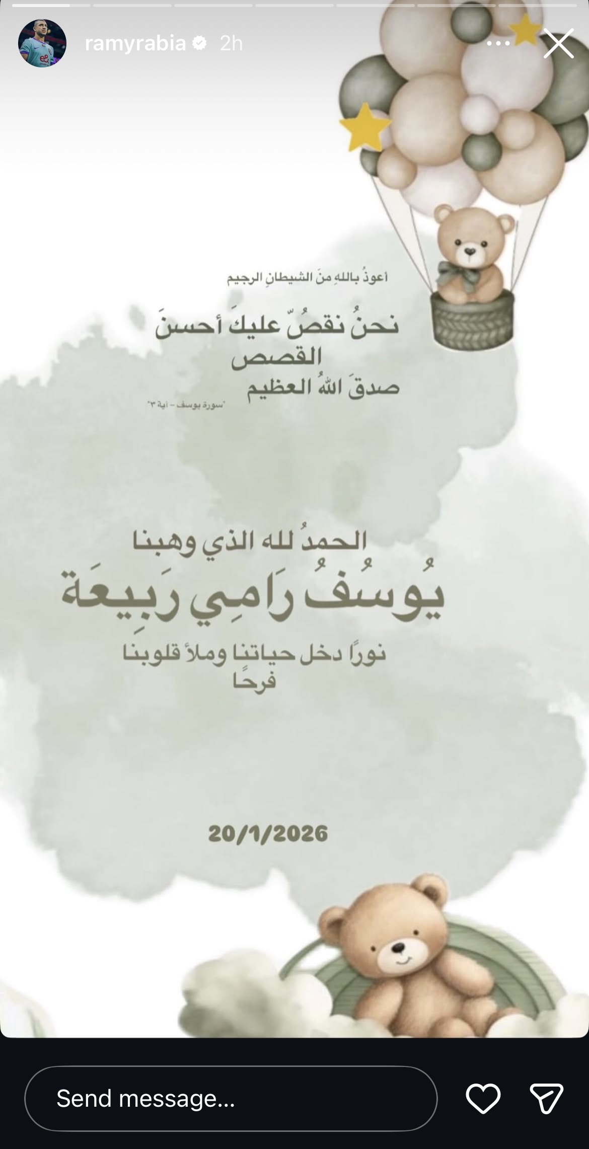 رزق رامي ربيعة، لاعب منتخب مصر، والعين الإماراتي، بمولوده الثاني “يوسف” أمس الثلاثاء.