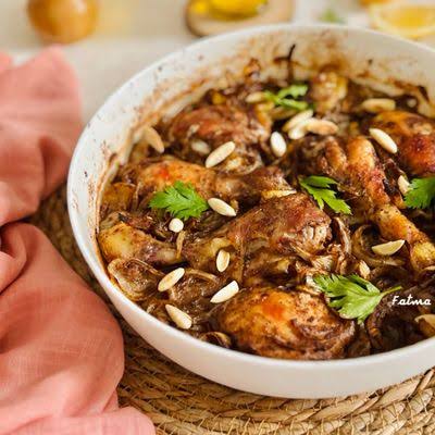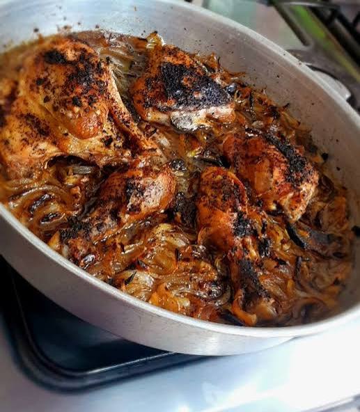 ـ تُفرد شرائح البصل في قاع الصينية، ثم يُرص الدجاج فوقها مع باقي التتبيلة.