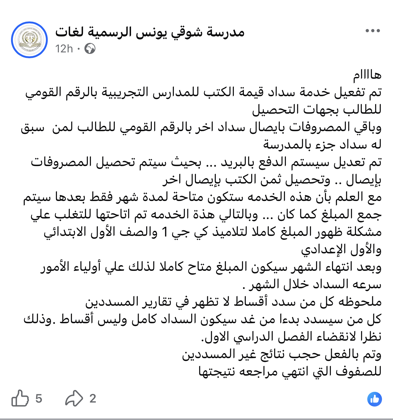 حيث أكدت المدارس أنه تم تفعيل خدمة سداد قيمة كتب المدارس التجريبية بالرقم القومي للطالب بجهات التحصيل ، وباقي المصروفات بايصال سداد اخر بالرقم القومي للطالب لمن لم يسبق له سدادها