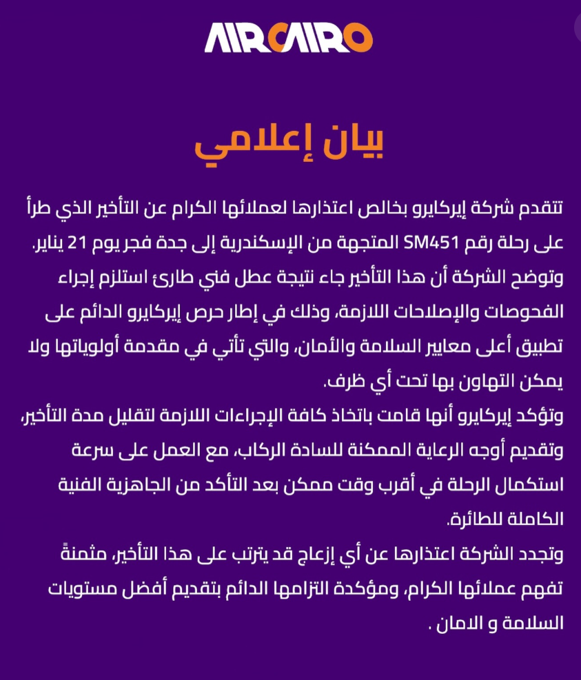 وأكدت "إير كايرو" أن هذا الإجراء يأتي انطلاقاً من التزامها الصارم بتطبيق أعلى معايير السلامة والأمان العالمية، مشددة على أن أمن وسلامة المسافرين يمثلان الأولوية القصوى التي لا يمكن التهاون فيها تحت أي ظرف.
