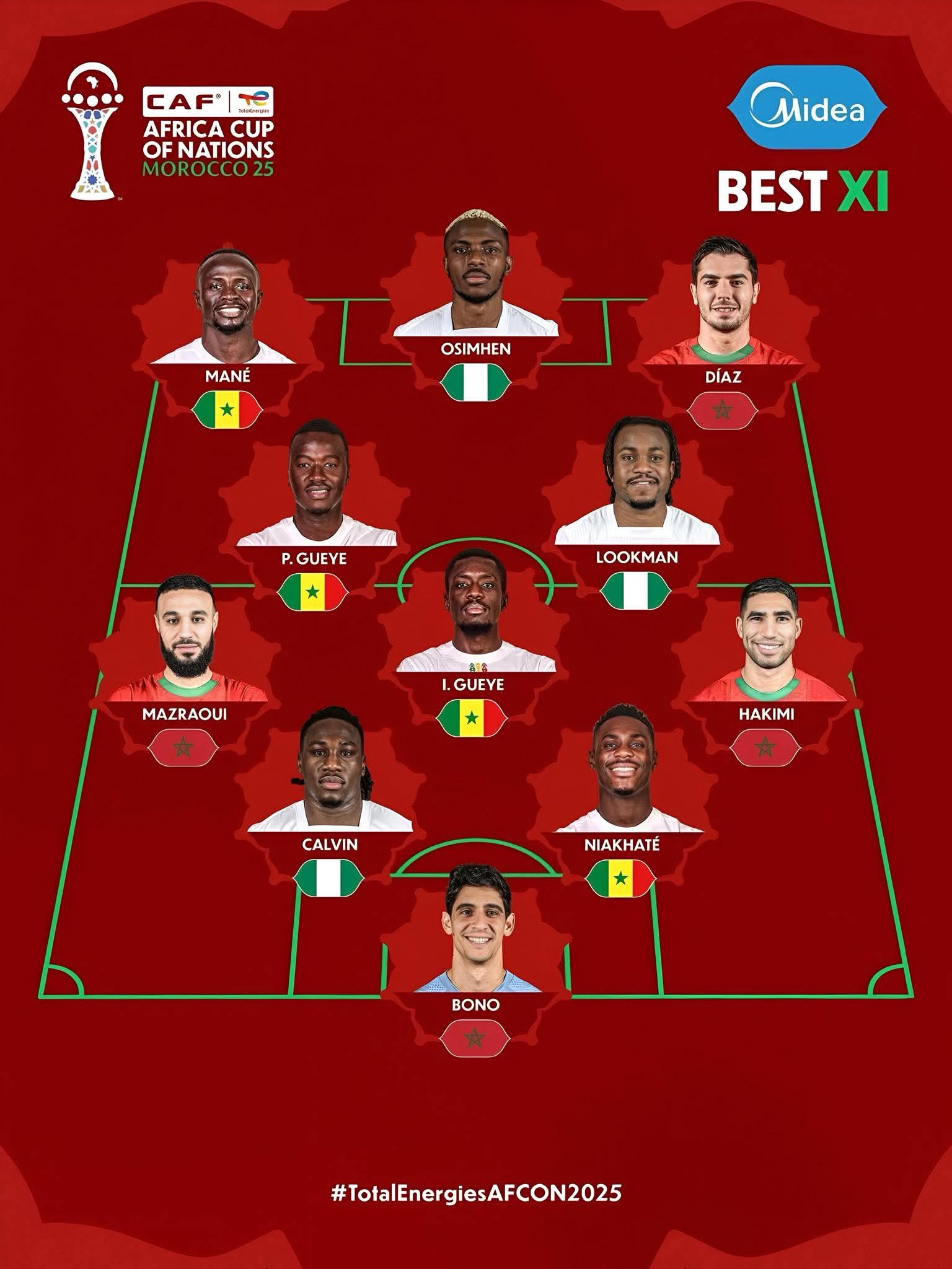 خط الهجوم : دياز "المغرب" - ساديو ماني "السنغال " - أوسيمين "نيجيريا"