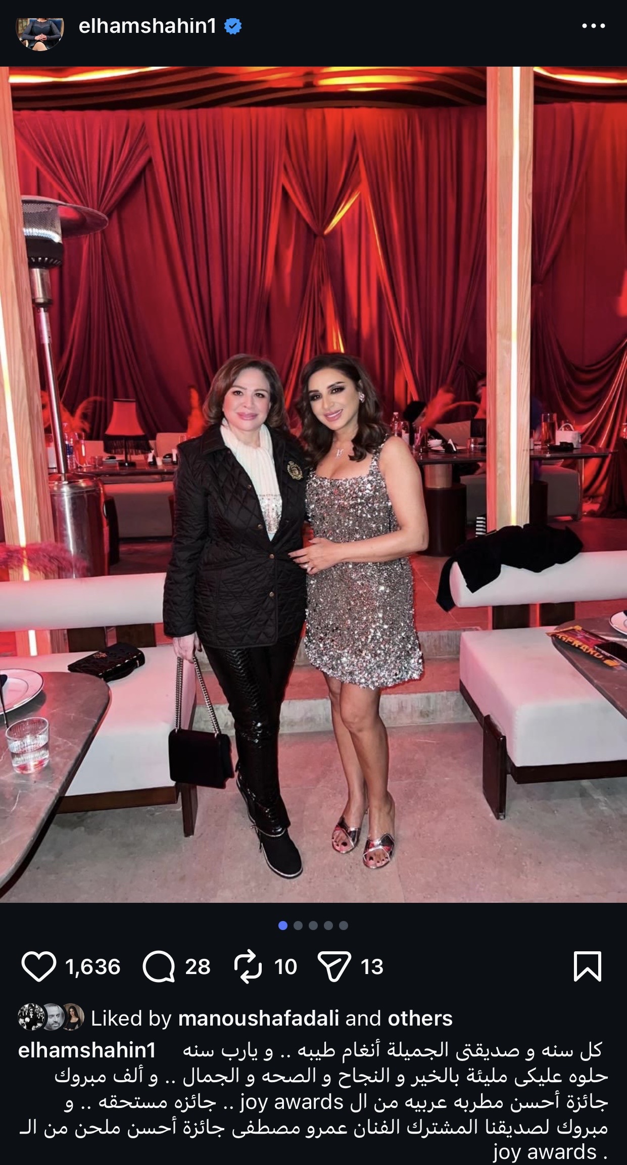 ونشرت إلهام شاهين صور تجمعها بـ أنغام ومجموعة كبيرة من الفنانين عبر حسابها الشخصي بموقع إنستجرام وعلقت على الصور قائلة: “كل سنه وصديقتى الجميلة أنغام طيبه .. ويارب سنة حلوه عليكى مليئة بالخير و النجاح و الصحه و الجمال .. وألف مبروك جائزة أحسن مطربة عربية من ال joy awards .. جائزه مستحقه .. و مبروك لصديقنا المشترك الفنان عمرو مصطفى جائزة أحسن ملحن من الـ joy awards”.