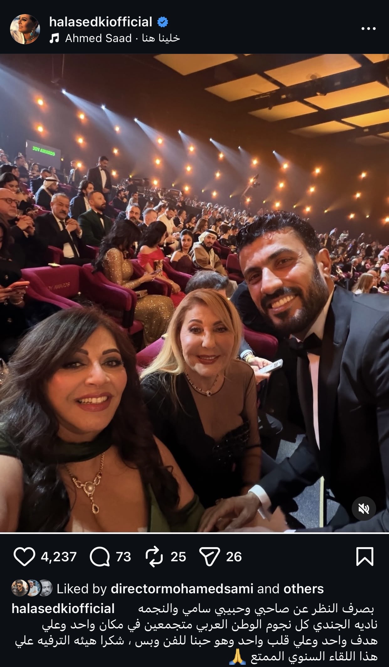 وكتبت هالة صدقي: "بصرف النظر عن صاحبي وحبيبي سامي والنجمة نادية الجندي، كل نجوم الوطن العربي متجمعين في مكان واحد وعلى هدف واحد وعلى قلب واحد وهو حبنا للفن وبس، شكراً هيئة الترفيه على هذا اللقاء السنوي الممتع".
