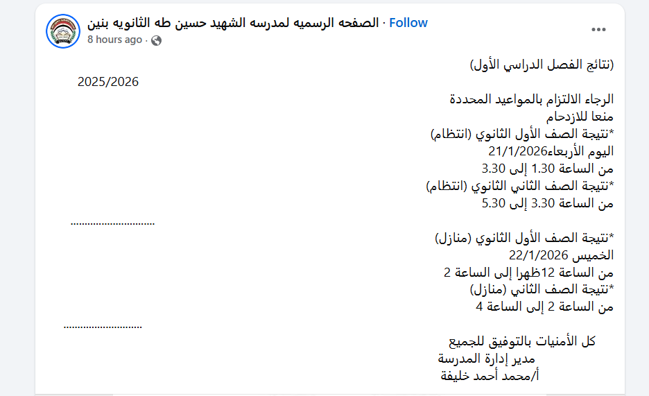 حيث أعلنت الصفحات الرسمية لبعض المدارس على موقع التواصل الإجتماعي فيس بوك ، في ظهور نتيجة أولى ثانوي 2026