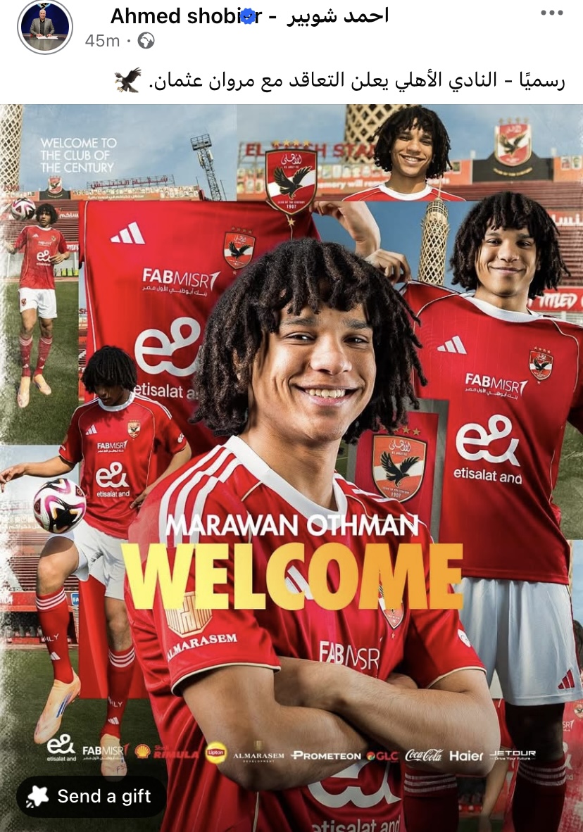 وكتب أحمد شوبير، عبر حسابه على موقع التواصل الاجتماعي “فيس بوك”: "رسميًا.. النادي الأهلي يعلن التعاقد مع مروان عثمان".