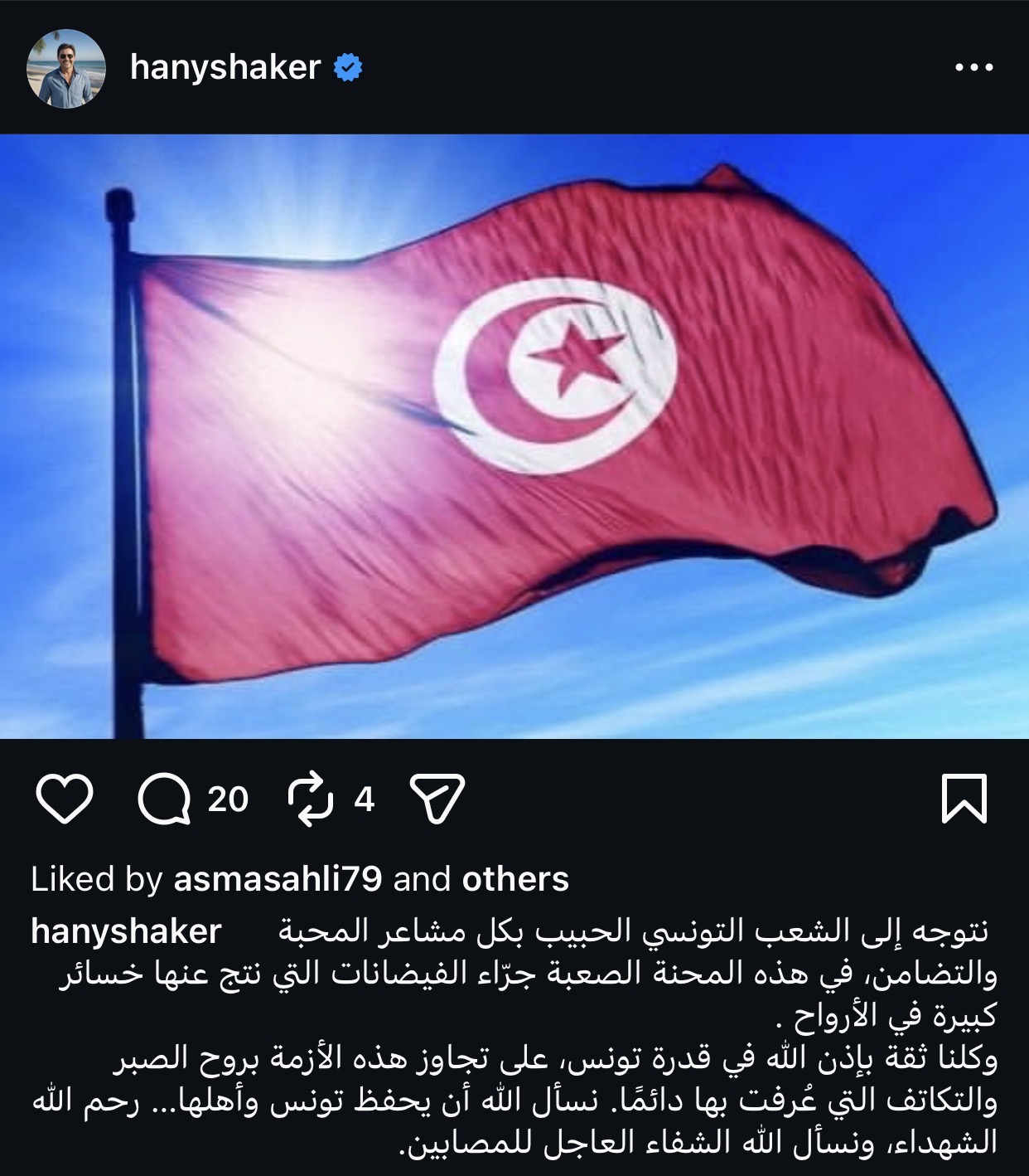 وكتب هاني شاكر عبر حسابه الشخصي بموقع إنستجرام: "نتوجه إلى الشعب التونسي الحبيب بكل مشاعر المحبة