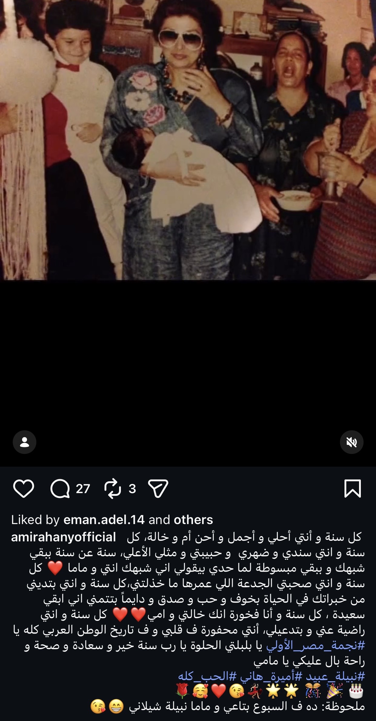 راضية عني و بتدعيلي، أنتي محفورة ف قلبي وف تاريخ الوطن العربي كله يا نجمة مصر الأولي يا بلبلتي الحلوة يا رب سنة خير و سعادة وصحة و راحة بال عليكي يامامي".