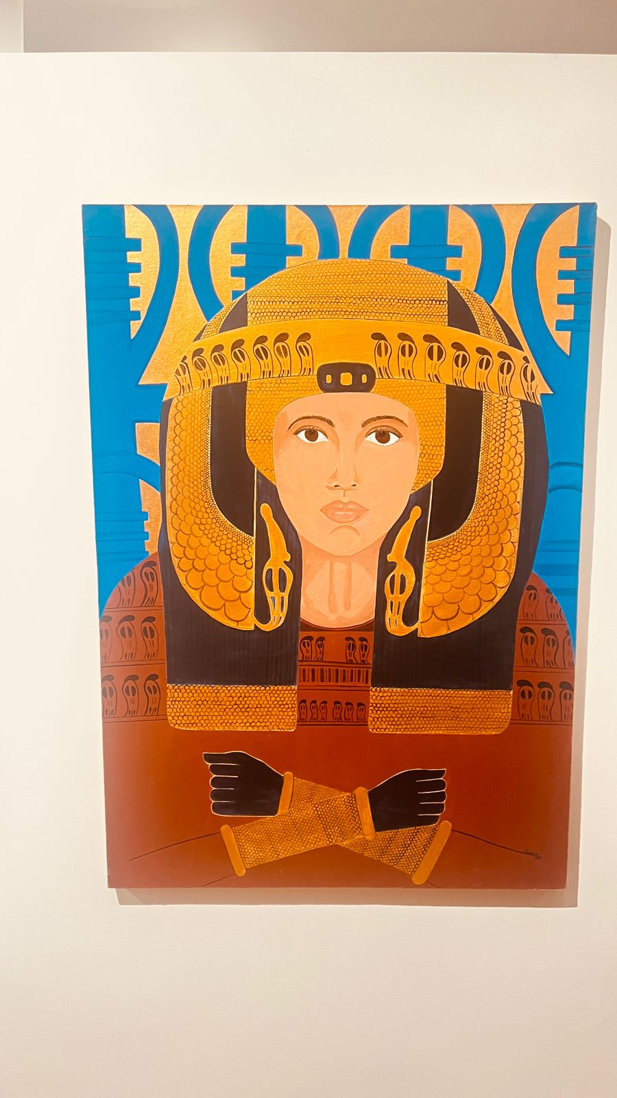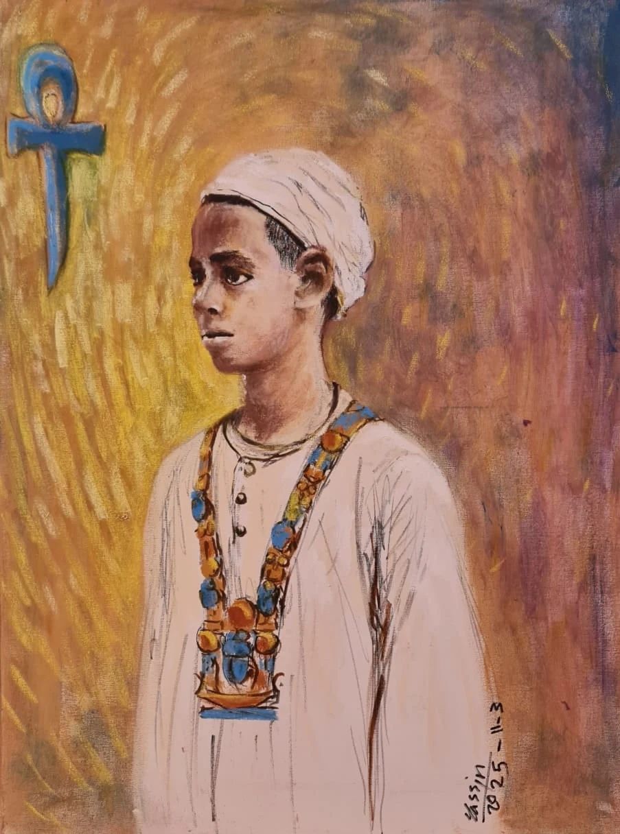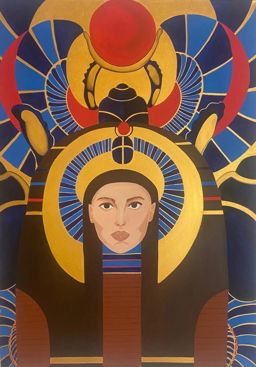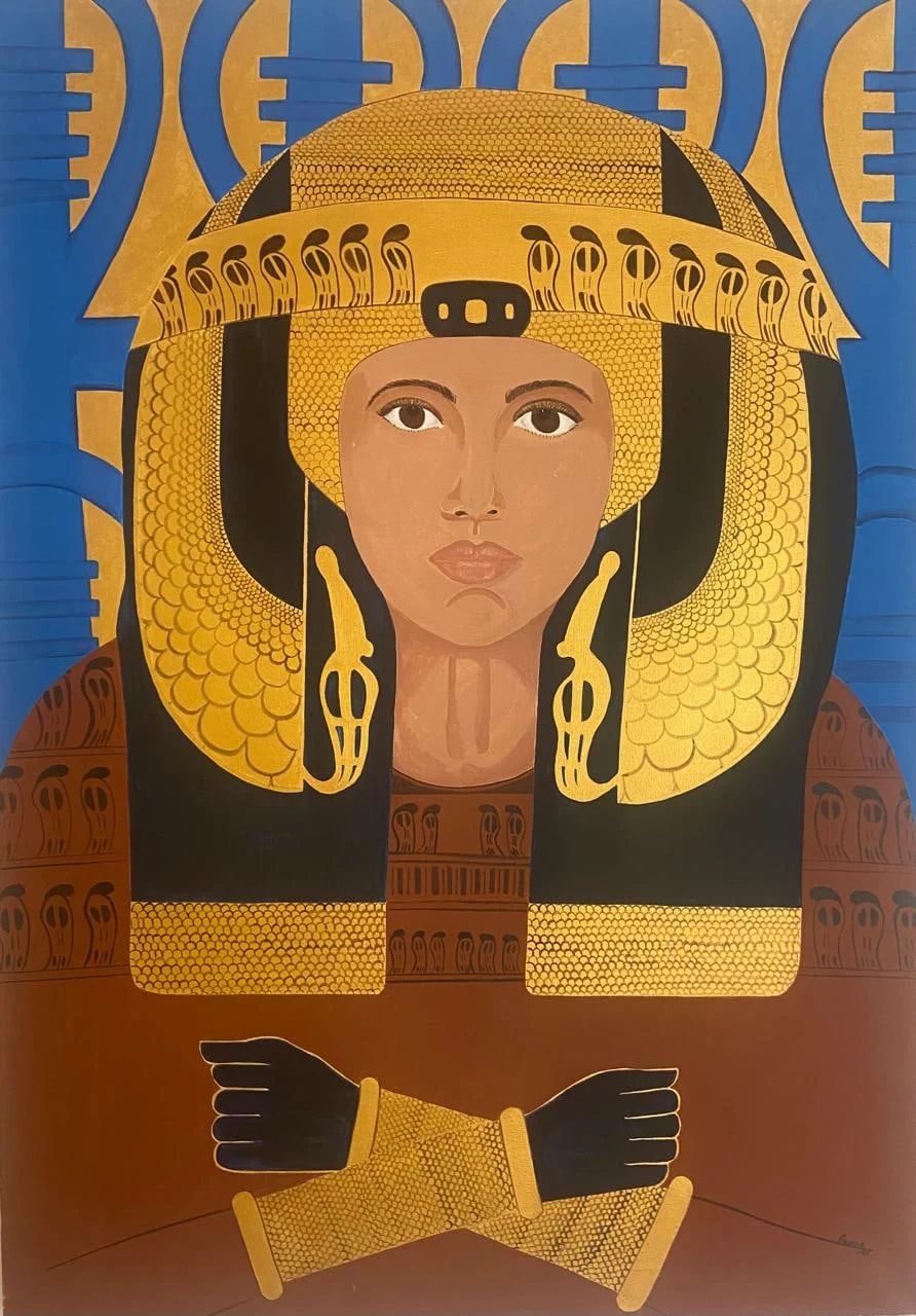 وتتجلى في جنبات المعرض رؤى بصرية مدهشة تعيد صياغة الهوية المصرية بروح جديدة جسورة.. يستحضر الفنانون الشبان رموزاً خالدة في هيئة وجوه ملكية تتدثر ببريق الذهب وجلال اللون الأزرق السماوي المقدس، فنشاهد بعثاً لملامح "نفرتيتي" برؤية مبتكرة.. وتداخل رموز "الأنخ" و"قلادة إيزيس" مع التشكيلات الهندسية المعاصرة في حوار بصري يربط بين الماضي والحاضر.. وكأن هؤلاء المبدعين يغزلون خيوط الهوية من جديد، مستلهمين جينات الأجداد لتقديمها في حلة تناسب صخب القرن الواحد والعشرين، وفي سياق الابتكار التقني كما يظهر في تلك اللوحات التي تدمج بين البورتريه والنصوص الوجدانية، مستحضرةً روح الفنانة العالمية "فريدا كالو" لكن بصبغة مصرية شرقية خالصة.. تضفي حساً أدبياً على التكوين البصري وتجعل من اللوحة نصاً مفتوحاً..