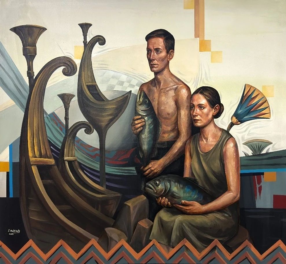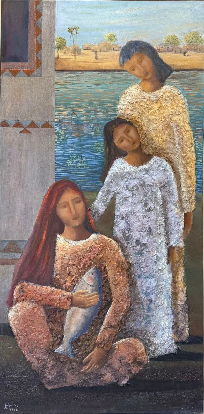 ولم يقتصر الإبداع على اللوحة المسطحة، بل امتد ليعانق الفراغ ويستنطق الخامة في تجليات نحتية وتشكيلية مبهرة؛ فنرى أعمالاً تجريدية.. وتكثيف السطح الملامس لتبدو كأنها قطع مستقطعة من ذاكرة الجدران العتيقة أو من تضاريس الأرض، تتماوج فيها تدرجات البني والأزرق والرمادي لتخلق حالة من الغموض البصري الذي يجبر المشاهد على التأمل والبحث عن المعنى.. وفي زاوية أخرى تبرز الواقعية التعبيرية في تصوير اشخاص من لحم ودم.. فتطل علينا ملامح الفلاحين والصيادين بوجوه نيلية أصيلة تحمل قلق الوجود وقوة الصبر.. بينما تتشابك ضفائر الفتيات في لوحات أخرى لتشكل دوائر من الصمت والحيرة.. في تكوينات تجمع بين خشونة الخامة وعذوبة الفكرة!! وبين صرامة التشريح وانسيابية المشاعر الإنسانية التي تجسد صراعات النفس وأحلامها المجهضة أو المرجأة اوالمستحيلة