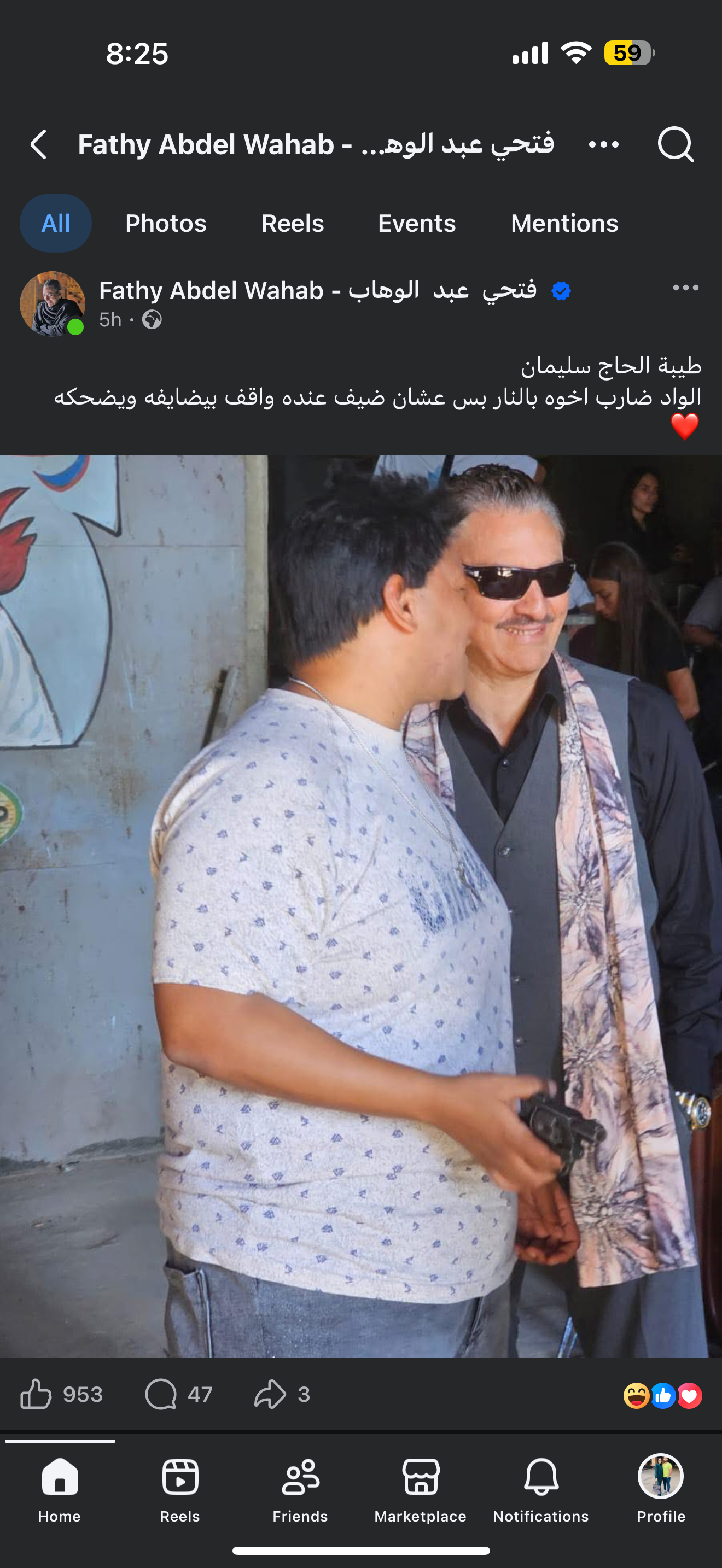 وعلّق فتحي عبدالوهاب على المشهد عبر حسابه على «فيسبوك» مازحًا: «طيبة الحاج سليمان.. الواد ضارب أخوه بالنار بس عشان ضيف عنده واقف بيضايفه ويضحكه»