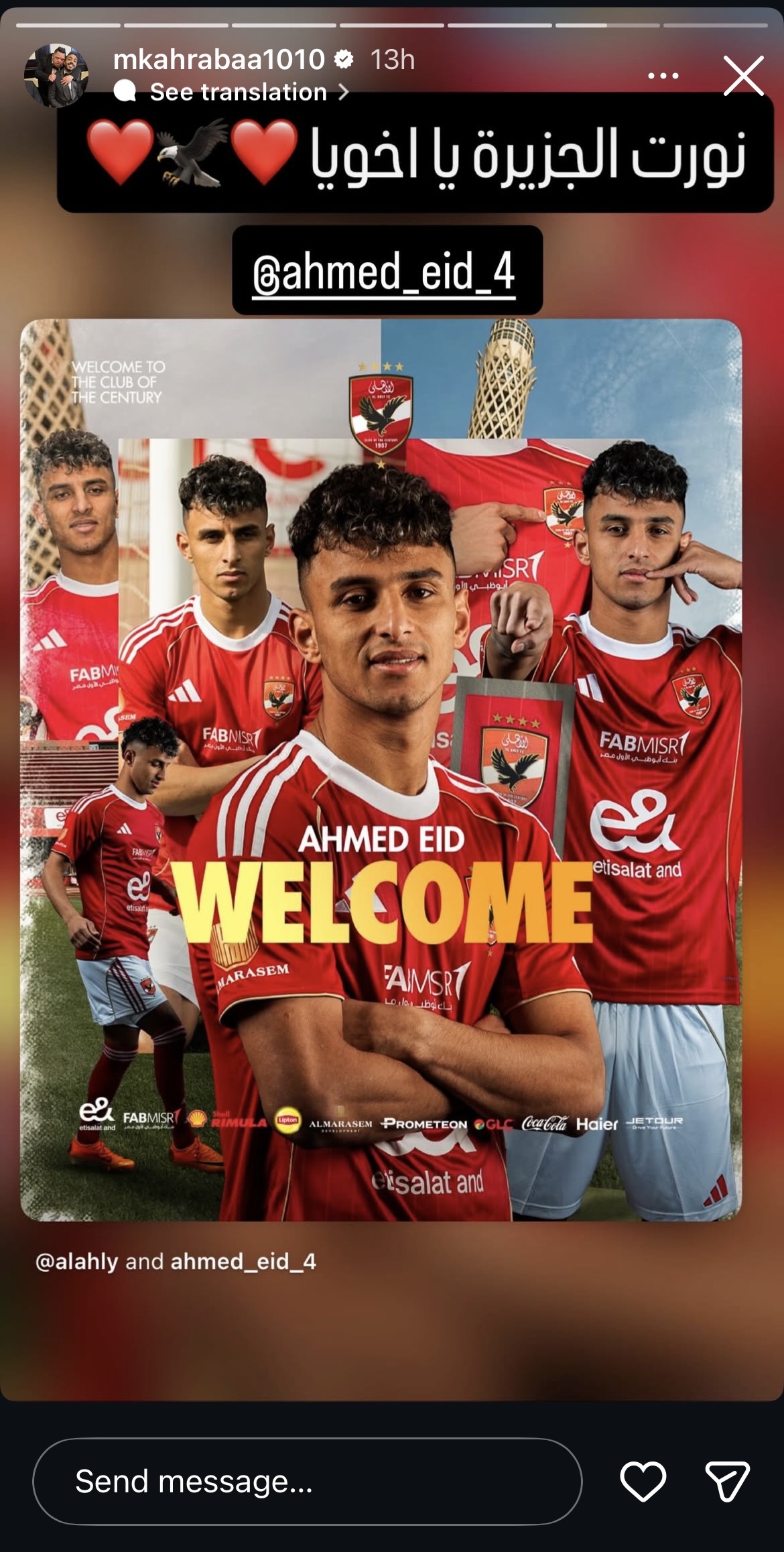 وجّه محمود كهربا، لاعب القادسية الكويتي، رسالة للاعب أحمد عيد بعد انتقاله للنادي الأهلي لمدة ٣ مواسم ونصف، خلال الميركاتو الحالي.