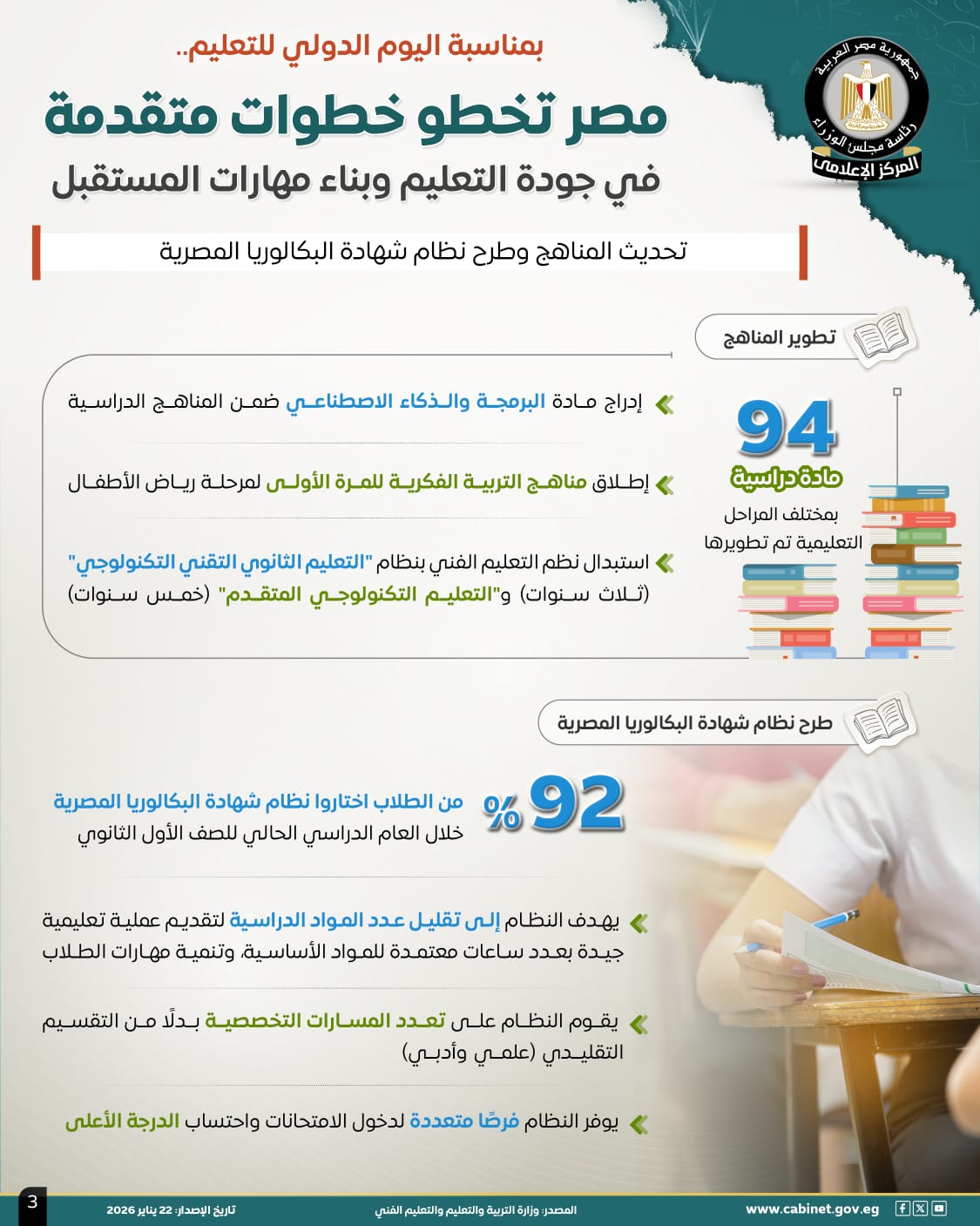 نشر المركز الإعلامي لمجلس الوزراء عددًا من الإنفوجرافات عبر منصاته على مواقع التواصل الاجتماعي، استعرض من خلالها التقدم الواضح الذي حققته مصر في جودة التعليم وبناء مهارات المستقبل.