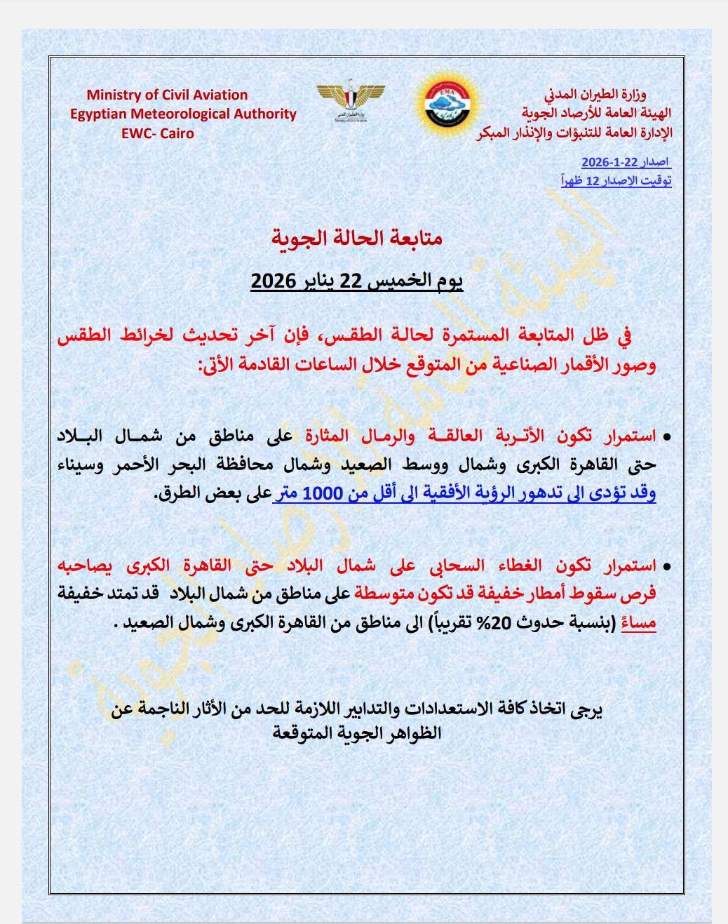 وأصدرت الهيئة العامة للأرصاد الجوية، بياناً لمتابعة حالة الطقس المتوقعة خلال الساعات القادمة من يوم الخميس الموافق 22 يناير 2026. وأفادت آخر تحديثات خرائط الطقس وصور الأقمار الصناعية باستمرار بعض الظواهر الجوية المؤثرة على الرؤية وحركة التنقل.