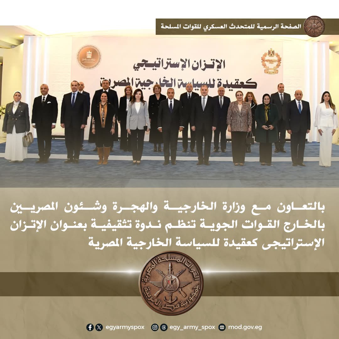 نظمت القوات الجوية ندوة تثقيفية بعنوان "الإتزان الإستراتيجى كعقيدة للسياسة الخارجية المصرية" بالتعاون مع وزارة الخارجية والهجرة وشئون المصريين بالخارج، وذلك بحضور الدكتور بدر عبد العاطى وزير الخارجية والهجرة وشئون المصريين بالخارج والدكتور أشرف صبحي وزير الشباب والرياضة واللواء طيار أح عمرو عبد الرحمن صقر قائد القوات الجوية وعدد من قادة وضباط القوات الجوية وأسرهم.
