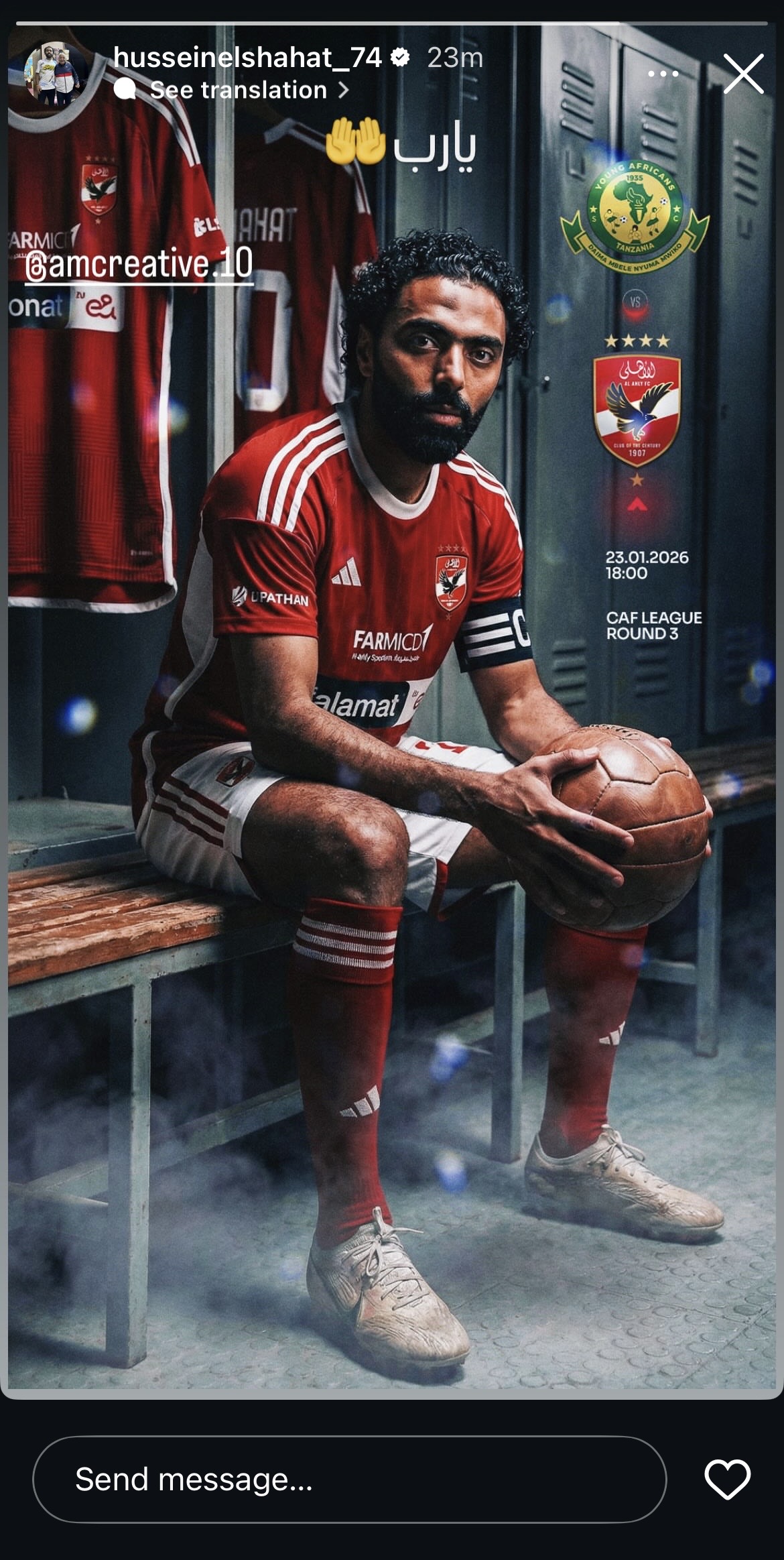 وشارك حسين الشحات لاعب النادي الأهلي موعد مباراة الغد أمام يانج افريكانز، وكتب عبر حسابه الرسمي على انستجرام: “يارب”.