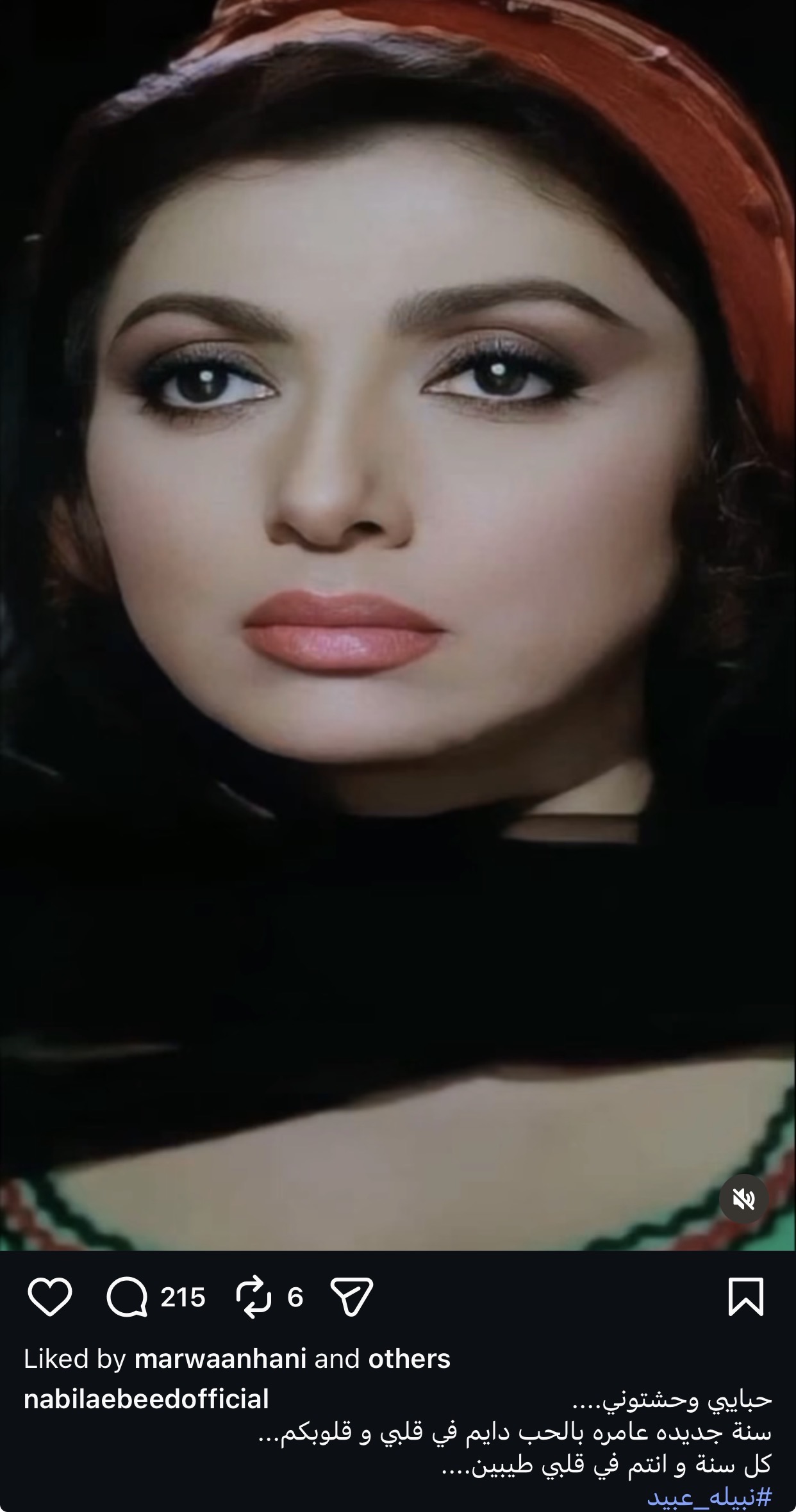 وكتبت نبيلة عبيد: "حبايبي وحشتوني، سنة جديدة عامرة بالحب دايما في قلبي وقلوبكم، كل سنة وأنتم في قلبي طيبين".