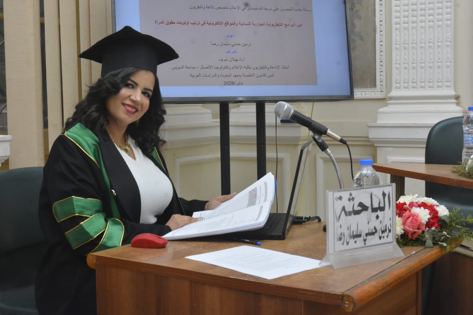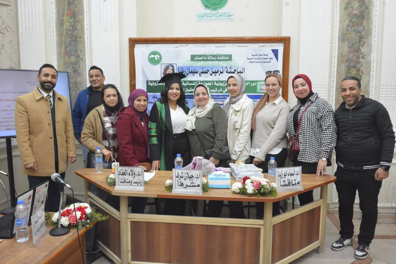 تشكلت لجنة المناقشة والحكم من نخبة من كبار أساتذة الإعلام، برئاسة أ.د. ولاء إبراهيم عقاد، أستاذ الإذاعة والتليفزيون وعميدة كلية الإعلام بنات جامعة الأزهر (مناقشًا ورئيسًا)، وعضوية كل من أ.د. جيلان محمود شرف، أستاذ الإذاعة والتليفزيون بكلية الإعلام وتكنولوجيا الاتصالات بجامعة السويس وأمين الشئون التعليمية بالمعهد (مشرفًا)، وأ.م.د. أسماء أحمد أبو زيد، أستاذ الصحافة المساعد بكلية الإعلام جامعة القاهرة ومعهد البحوث والدراسات العربية (مناقشًا).