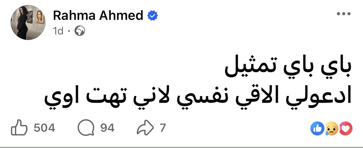 وكانت قد أعلنت الفنانة رحمة أحمد عن اعتزالها التمثيل قبل أيام عبر منشور لها قالت فيه: “باي باي تمثيل، ادعولي ألاقي نفسي لأنهي توهت أوي”.