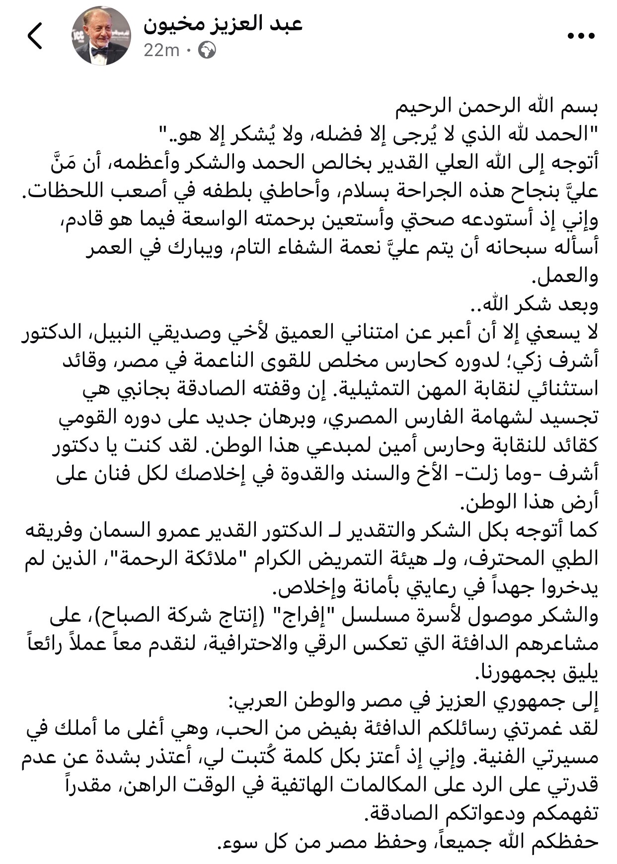 حرص الفنان عبد العزيز مخيون على طمأنة جمهوره ومحبيه على حالته الصحية، بعد خضوعه لعملية جراحية، مؤكدًا على أن الجراحة تمت بنجاح وأن حالته مستقرة، ووجه الشكر لكل من سانده في محنته.