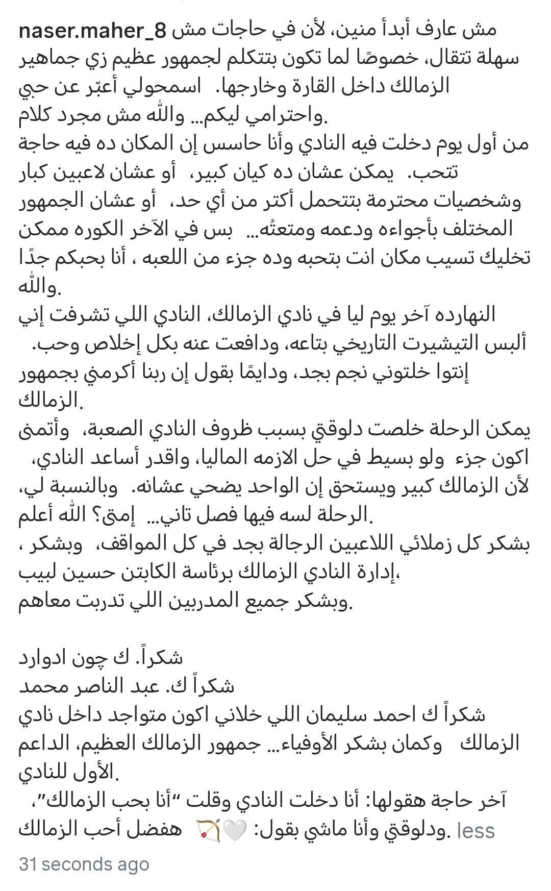 وكتب ناصر ماهر عبر حسابه الشخصي بموقع إنستجرام: "مش عارف أبدأ منين، لأن في حاجات مش سهلة تتقال، خصوصًا لما تكون بتتكلم لجمهور عظيم زي جماهير الزمالك داخل القارة وخارجها. اسمحولي أعبّر عن حبي