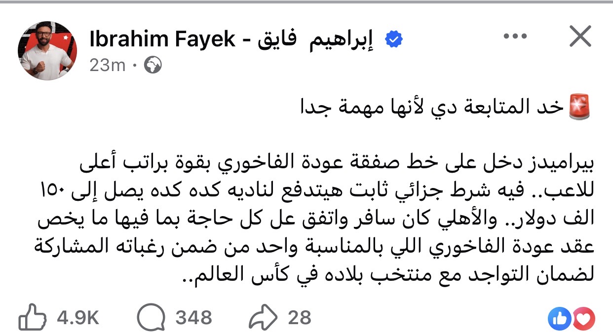 وكتب فايق عبر حسابه الشخصي بموقع فيسبوك: “خد المتابعة دي لأنها مهمة جدا..بيراميدز دخل على خط صفقة عودة الفاخوري بقوة براتب أعلى للاعب.. فيه شرط جزائي ثابت هيتدفع لناديه كده كده يصل إلى ١٥٠ الف دولار.. والأهلي كان سافر واتفق عل كل حاجة بما فيها ما يخص عقد عودة الفاخوري اللي بالمناسبة واحد من ضمن رغباته المشاركة لضمان التواجد مع منتخب بلاده في كأس العالم”.