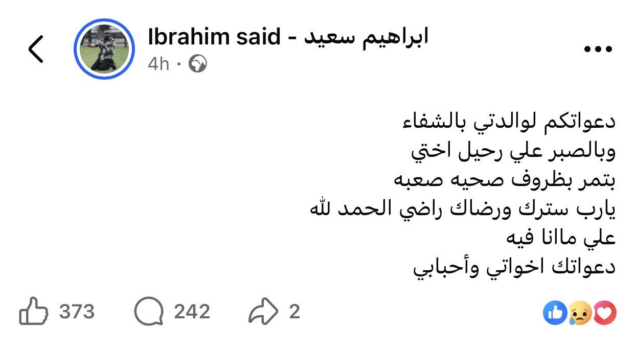 وكتب إبراهيم سعيد عبر حسابه الشخصي بموقع فيسبوك: “دعواتكم لوالدتي بالشفاء وبالصبر علي رحيل اختي بتمر بظروف صحيه صعبه يارب سترك ورضاك راضي الحمد لله علي ماانا فيه دعواتك اخواتي وأحبابي”.
