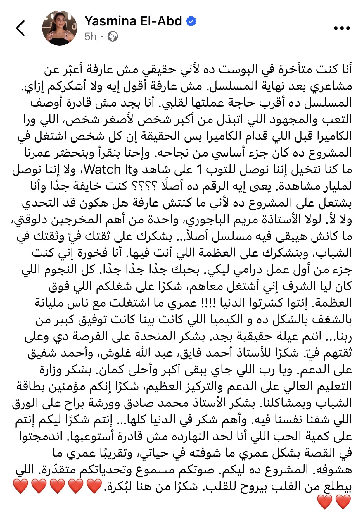وكتبت ياسمينا، عبر حسابها الشخصي بموقع فيسبوك، أنها لم تكن قادرة على وصف حجم المجهود والتعب الذي بذله فريق العمل بالكامل، سواء من يقفون خلف الكاميرا أو أمامها، مشددة على أن كل شخص شارك في المسلسل كان جزءًا أساسيًا من نجاحه.