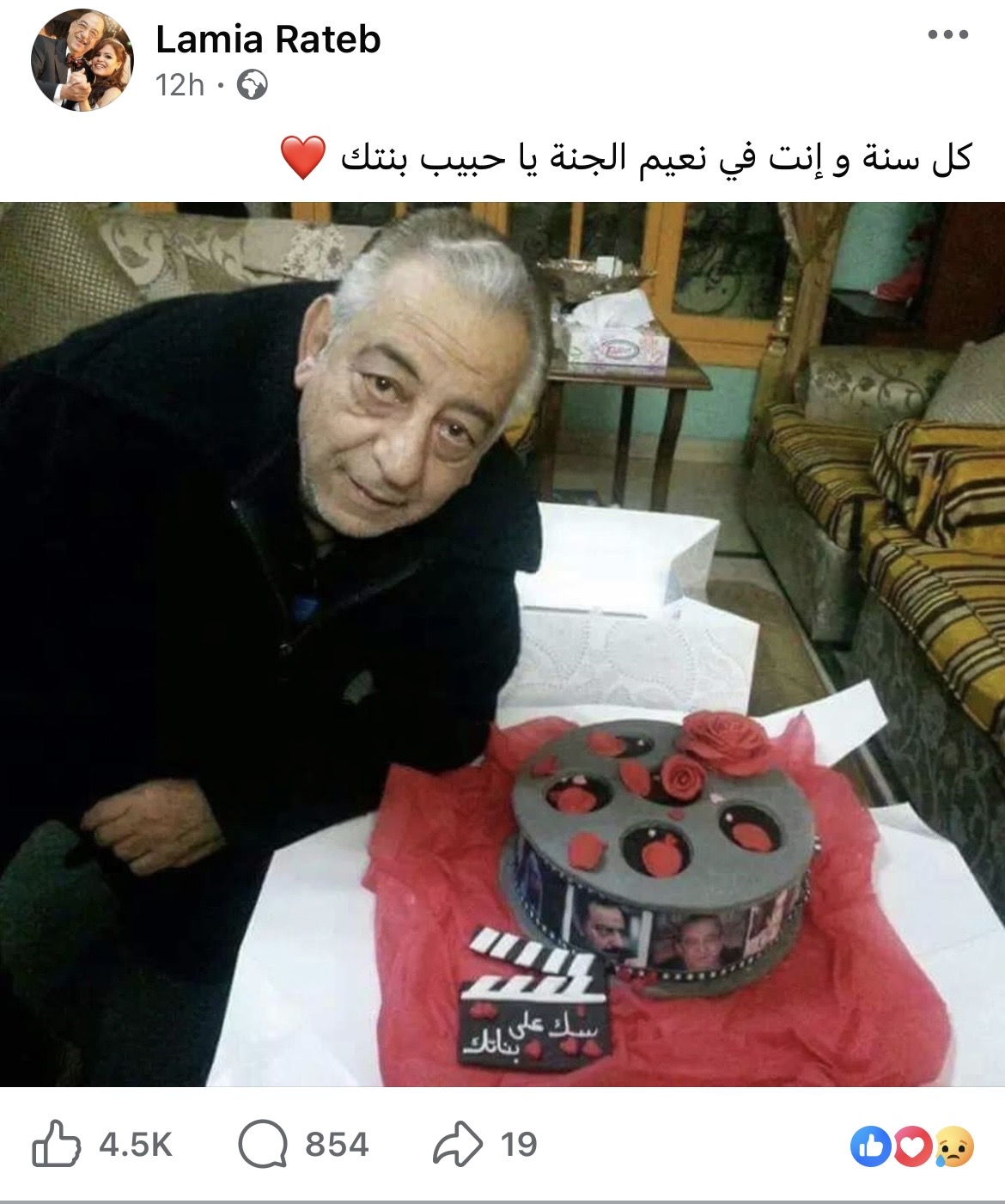 وكتبت لمياء عبر حسابها الرسمي على فيسبوك على صورة والدها أحمد راتب: “كل سنة وأنت في نعيم الجنة يا حبيب بنتك”.