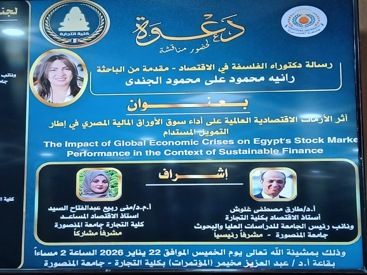 ويعكس هذا الإنجاز تميز الباحثة وجهدها العلمي، ويؤكد دور جامعة المنصورة في دعم البحث العلمي وإعداد كوادر أكاديمية قادرة على الإسهام بفعالية في معالجة القضايا الاقتصادية المعاصرة.