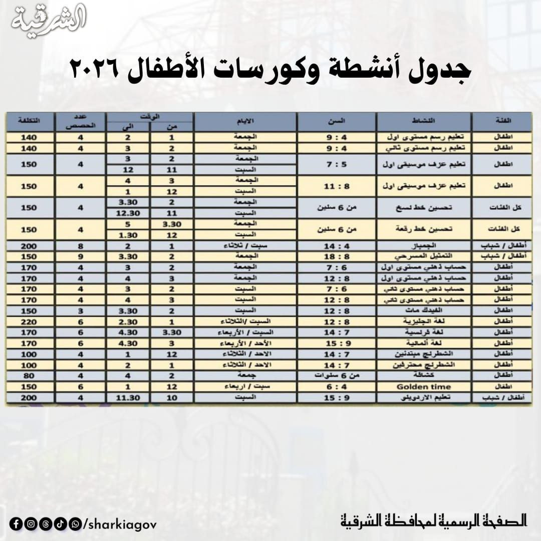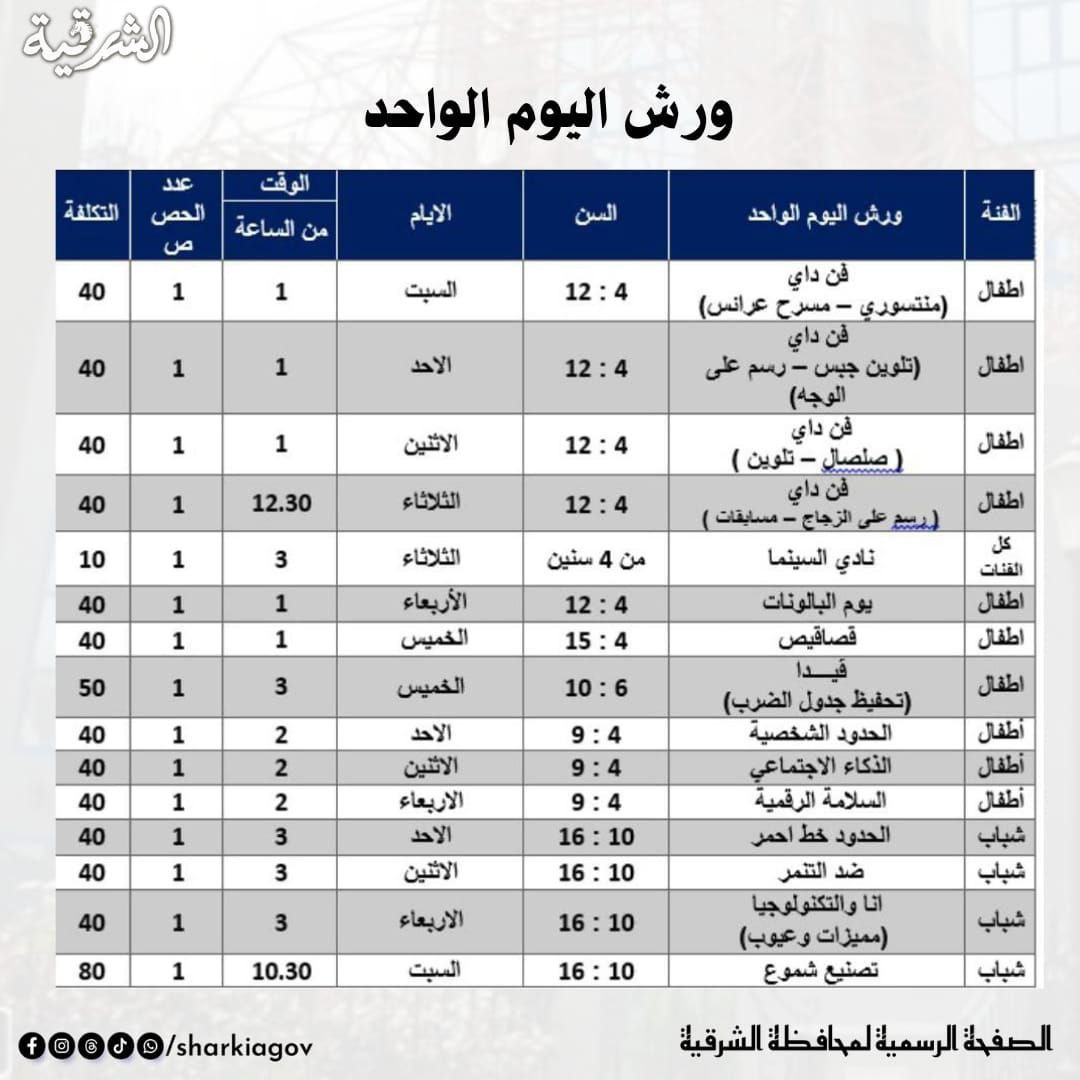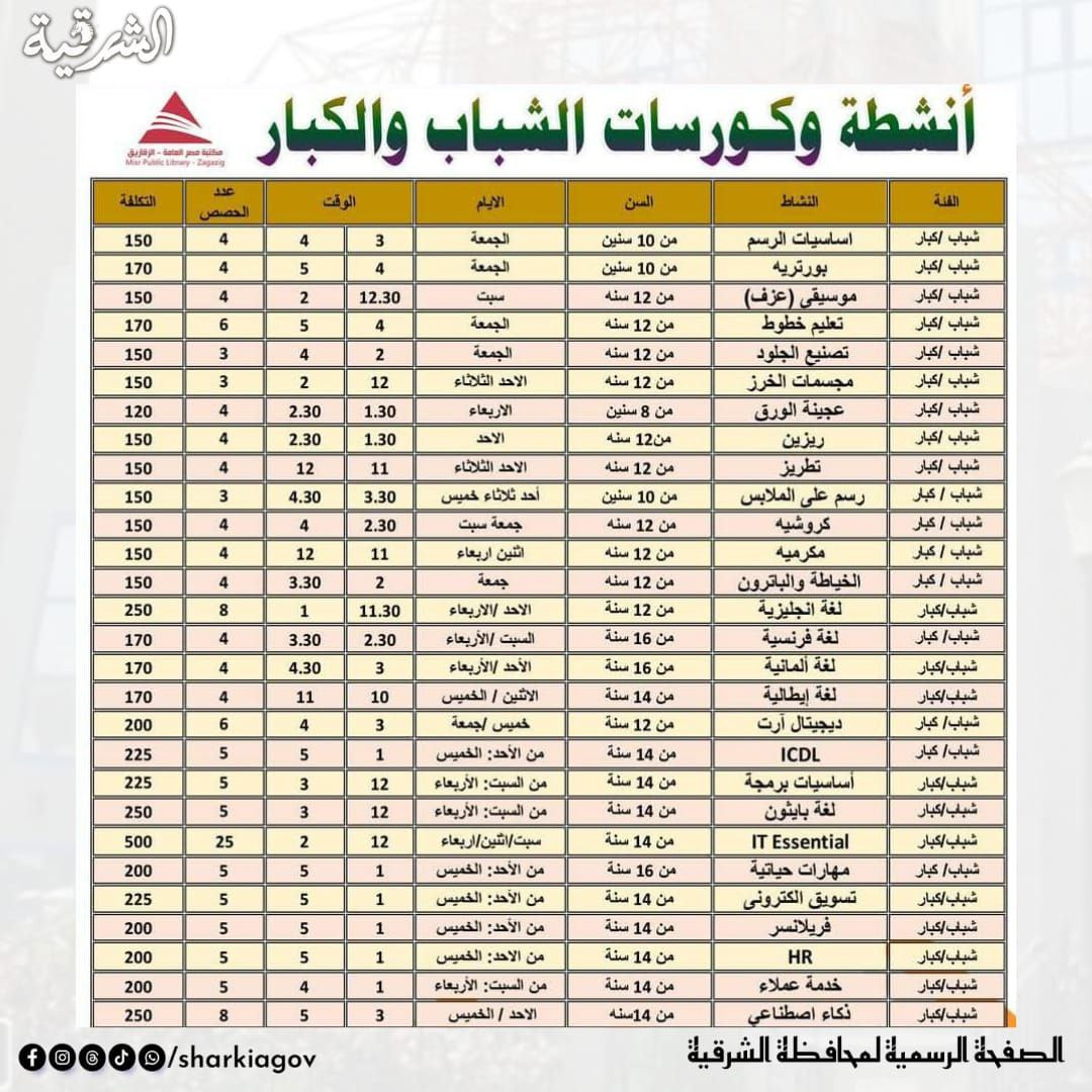ومن جانبها أشارت رانيا حشيش مديرة مكتبة مصر العامة بالزقازيق إلى أن فريق عمل المكتبة سيقدم خلال إجازة نصف العام عدة أنشطة في أجواء ترفيهية وتعليمية مُحفّزة تنمّى المهارات وتصقل الإبداع وذلك طوال أيام الأسبوع فى المجالات الآتية..ورش اليوم الواحد وتشمل " مسرح عرائس – أعمال فنية – أكسسورات - صلصال – تلوين – رسم على الزجاج – مسابقات – ريسيكل – رسم على الوجه – كونكريت – تحفيظ جدول الضرب – تصنيع الشمع – رسم على الملابس "وذلك للأطفال والشباب من سن (4 إلى 16) سنة .