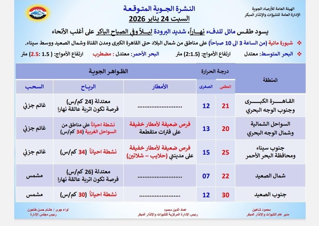 تتوقع الهيئة العامة للأرصاد الجوية أن يشهد غدا السبت 24 يناير 2026 طقسًا شديد البرودة في الصباح الباكر، مائلًا للدفء خلال ساعات النهار، على أن تعود الأجواء شديدة البرودة مرة أخرى ليلًا على أغلب أنحاء البلاد، في استمرار واضح لموجة الطقس البارد التي تشهدها البلاد خلال هذه الفترة.