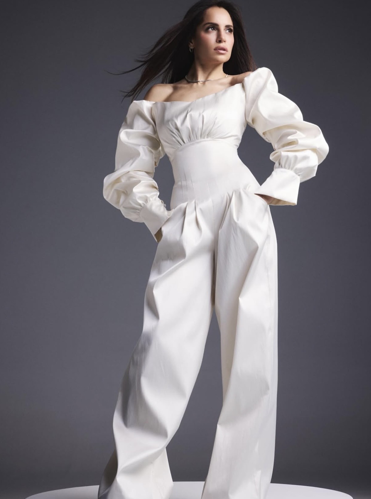 وجاء التصميم بقصة أنيقة، تميزت بأكمام منفوخة ولمسة أنثوية ناعمة، مع خصر محدد أبرز رشاقتها، كما اختارت بأن يكون البنطال واسع.